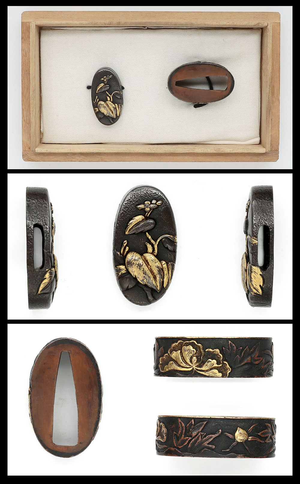 Special Feature: Shakudo base. Peony and other kinds of plants are engraved with gold.