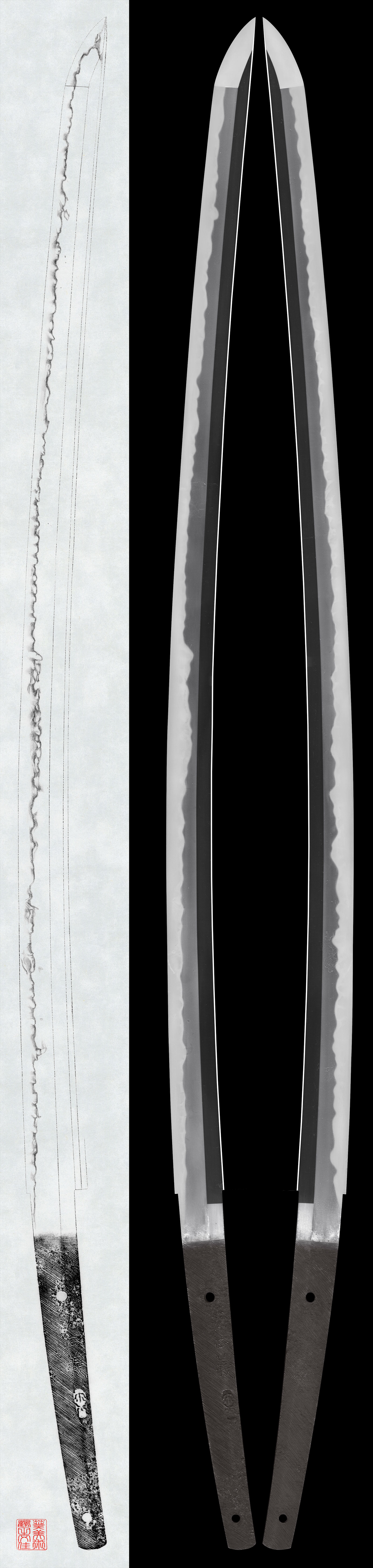 Shape: A deeply curved blade with an extended kissaki, showing an excellent overall shape.