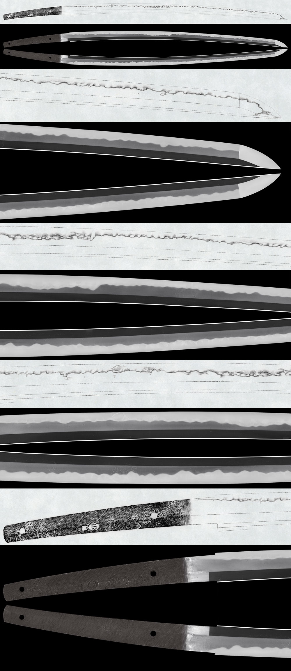 Hamon: Nie-deki, forming a midare of gunome, with a midare-komi boshi. It shows the distinctive hamon of Hosokawa Masayoshi.