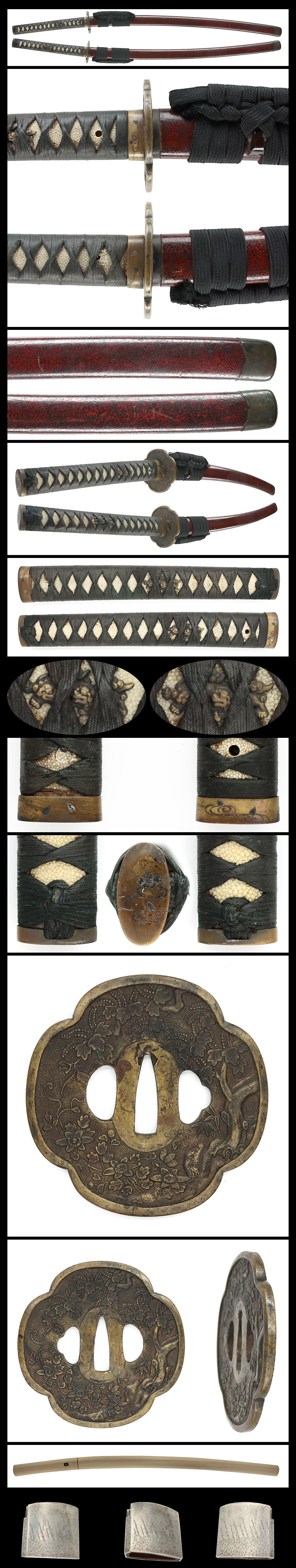 Tsuba: Mokko-shaped brass tsuba carved with paulownia and floral motifs.