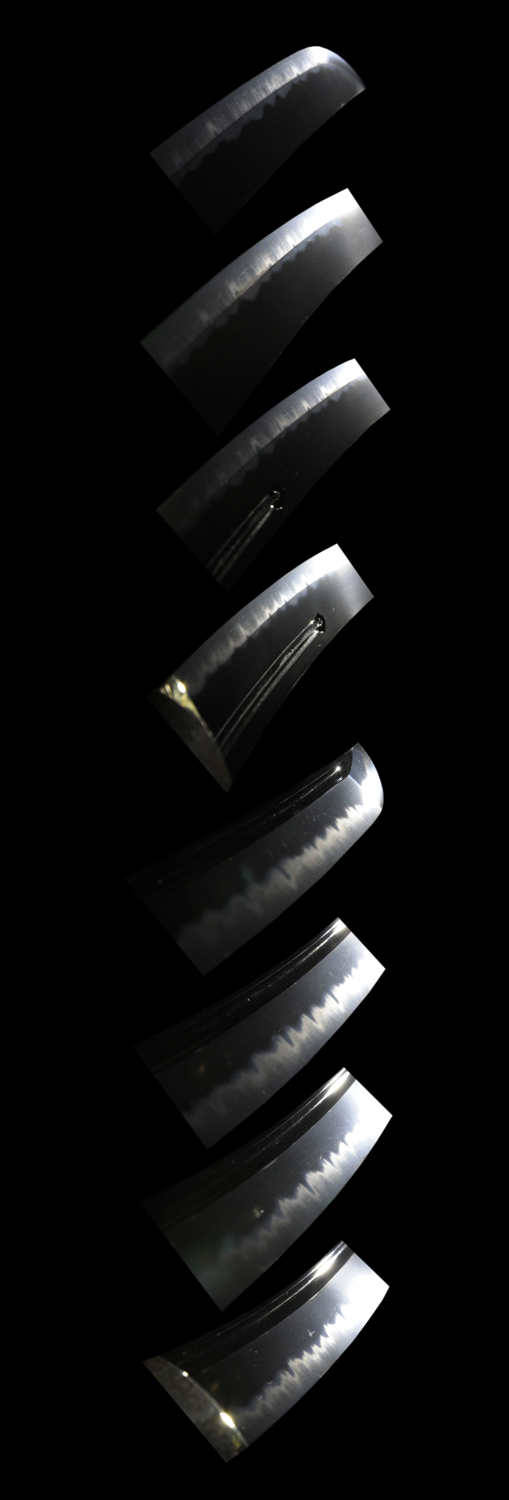 Hamon : Niedeki gunome midair with very thick nioikuchi and sunagashi and also Kinsuji work.