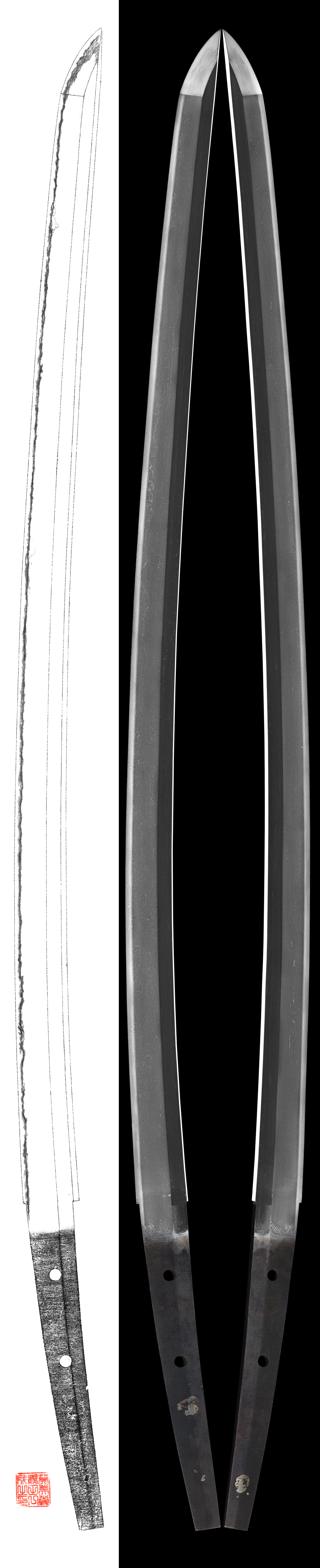 Shape : The blade is oosuriage mumei(cut shortened) regula sized with deep sori and long kissaki nice looking shape.