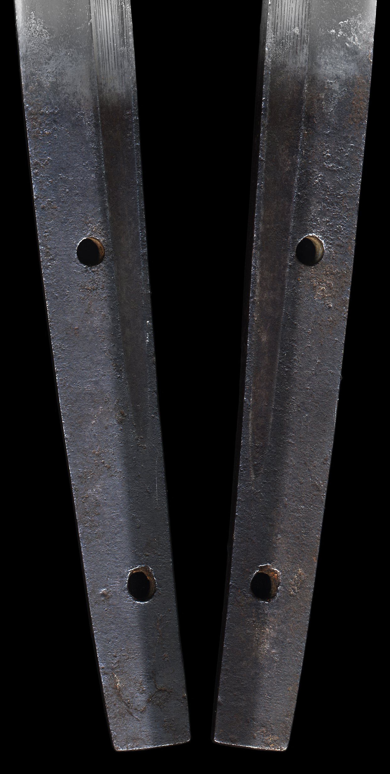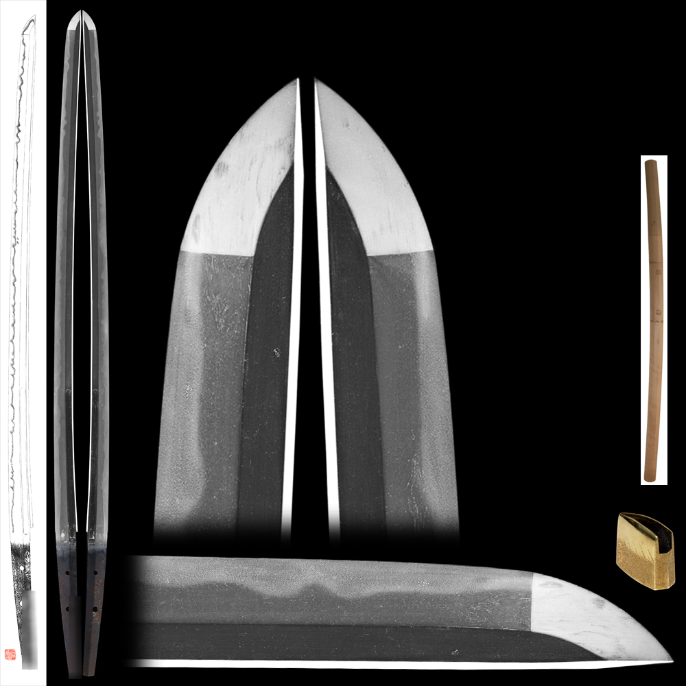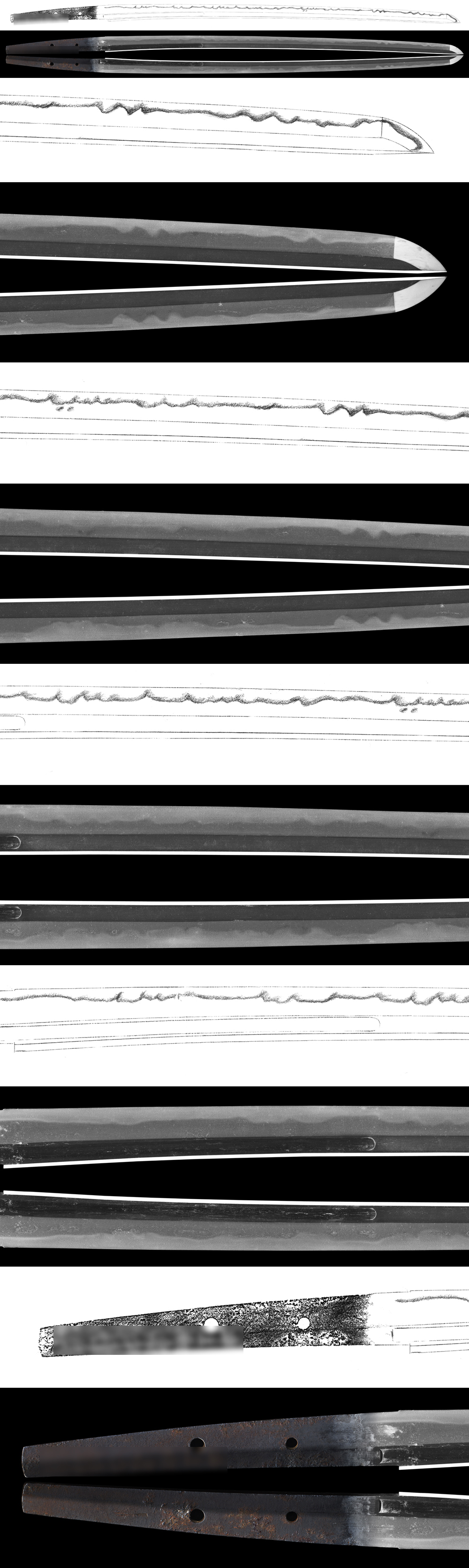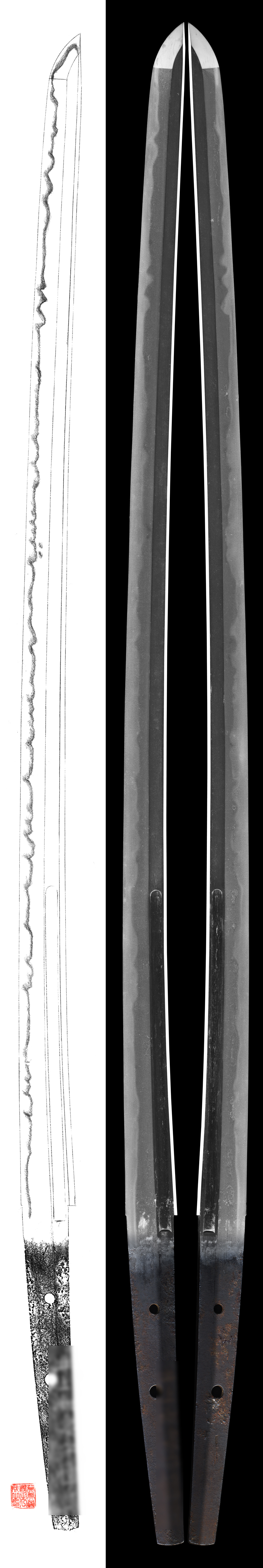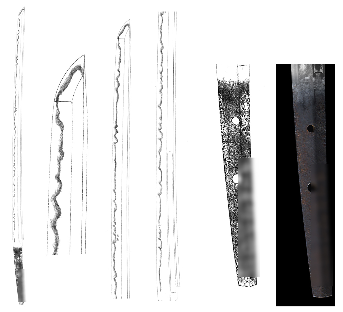 Shape : Regular size width and thickness. It is shallow curve katana. There are some suriage(tang cut shorten) on the nakago.