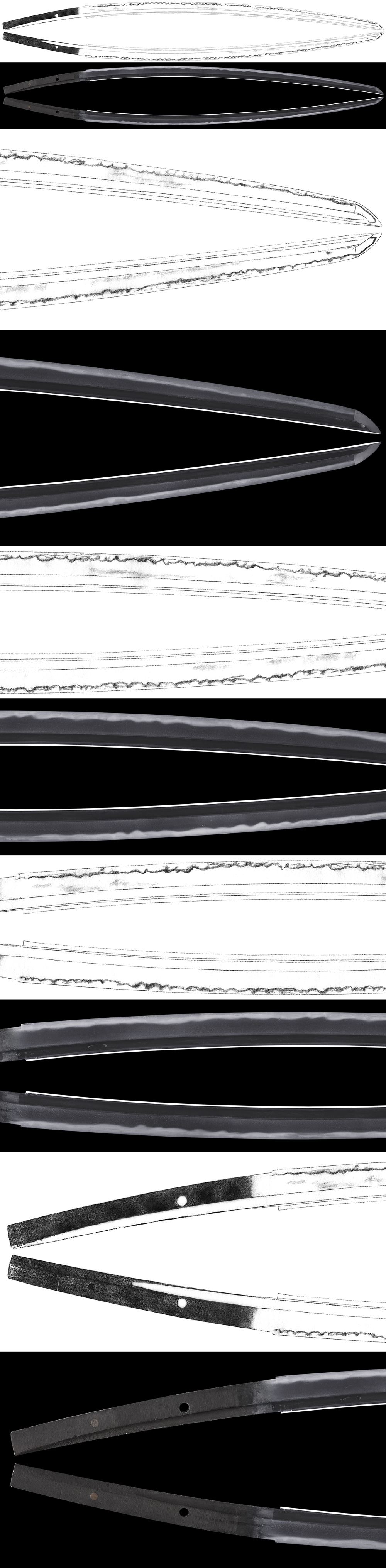 The jigane is ko-itame hada well grained with mixture of Ko-mokume hada. It is clear jigane with rough utsuri appearing. Hamon is shoji midair with some edgy parts. Ashi and yo is active in the ha.