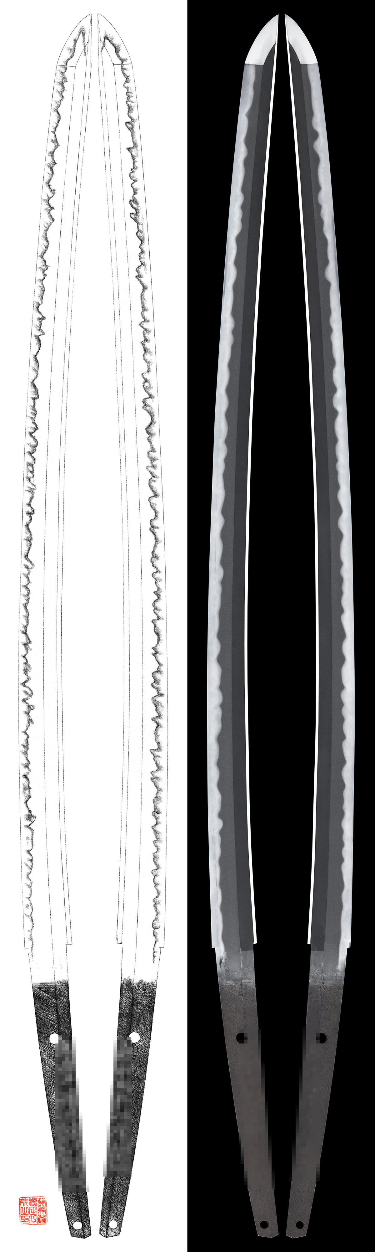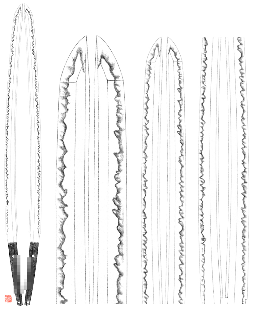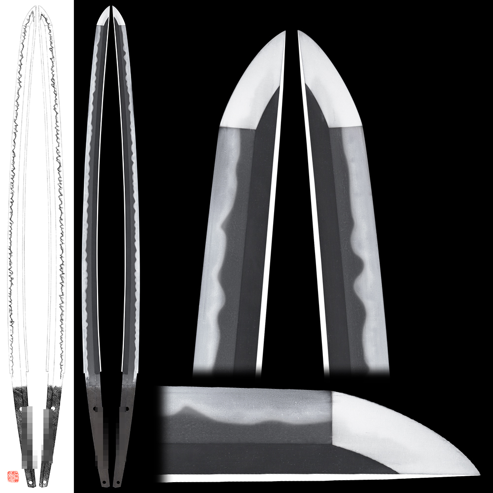 His subject was influenced a lot from his father Kagemitsu especially Kataochi gunome midare hamon. There are very few Zaimei swords(with signature) .