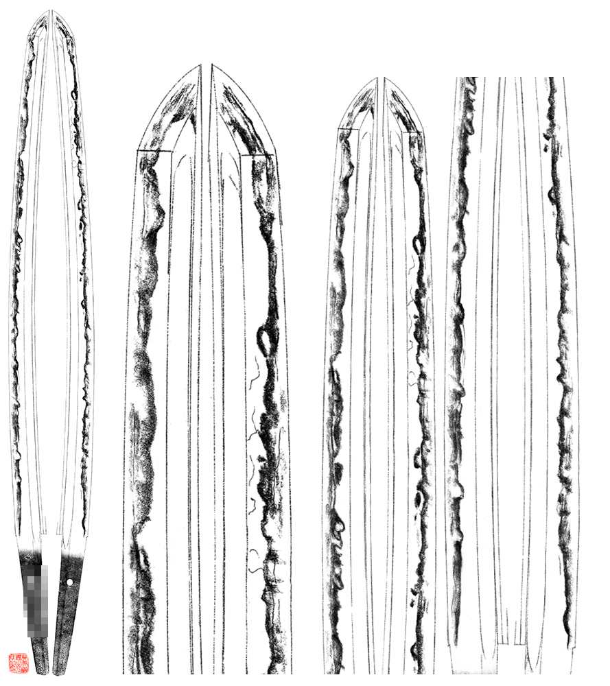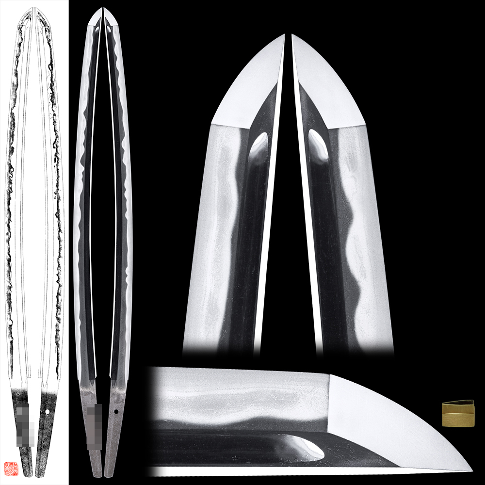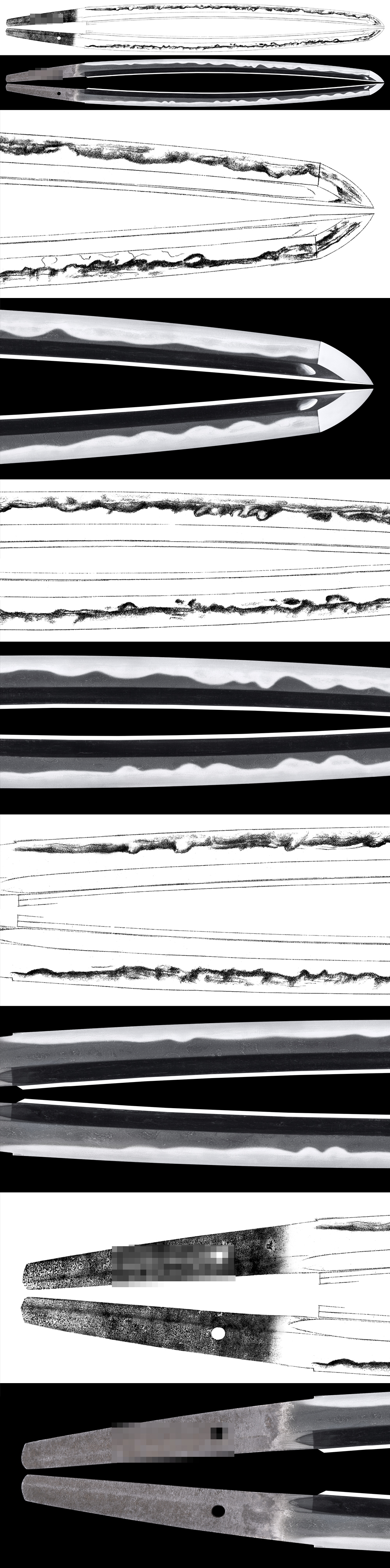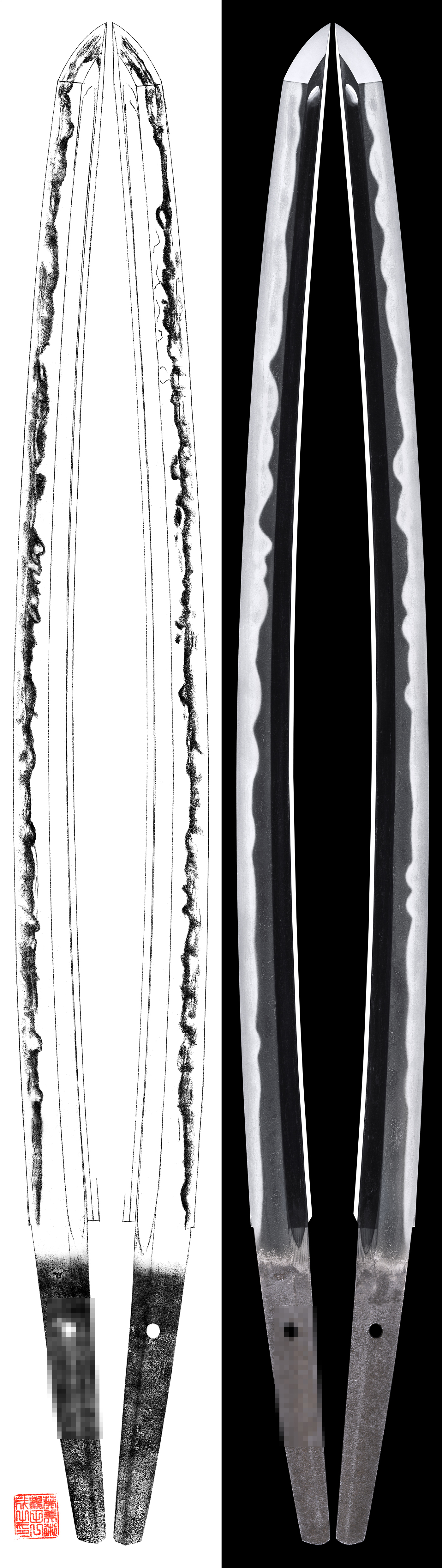 Hamon : Nie Deki, Deep Nioikuchi. From Hamachi wide Suguha, and then wide Ashi Gunome Midare. In Ha, there are Ashi, Yo, Sunagashi and Kinsuji.
