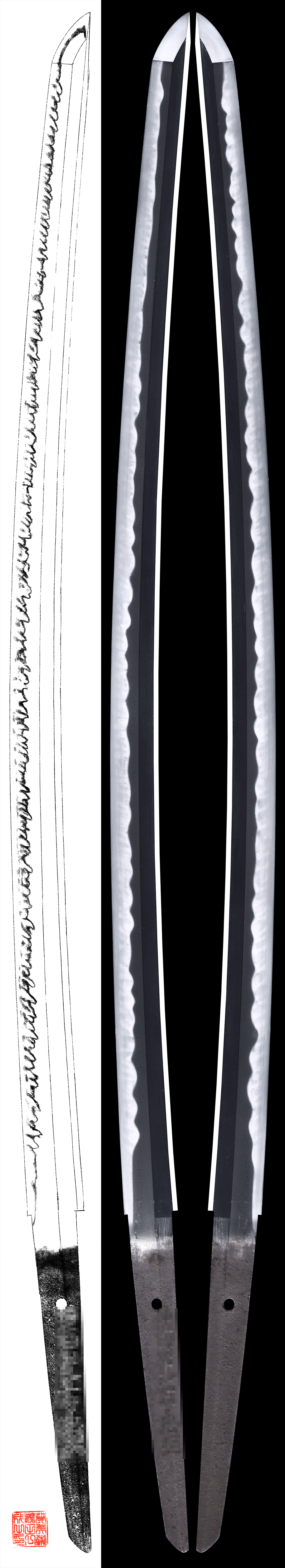 Special feature of this school is Kissaki hamon which is called Mishina Boshi notare anf turns back hamon.