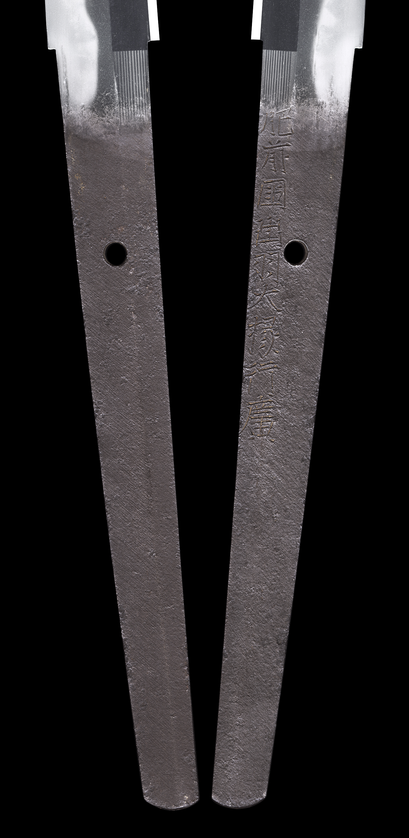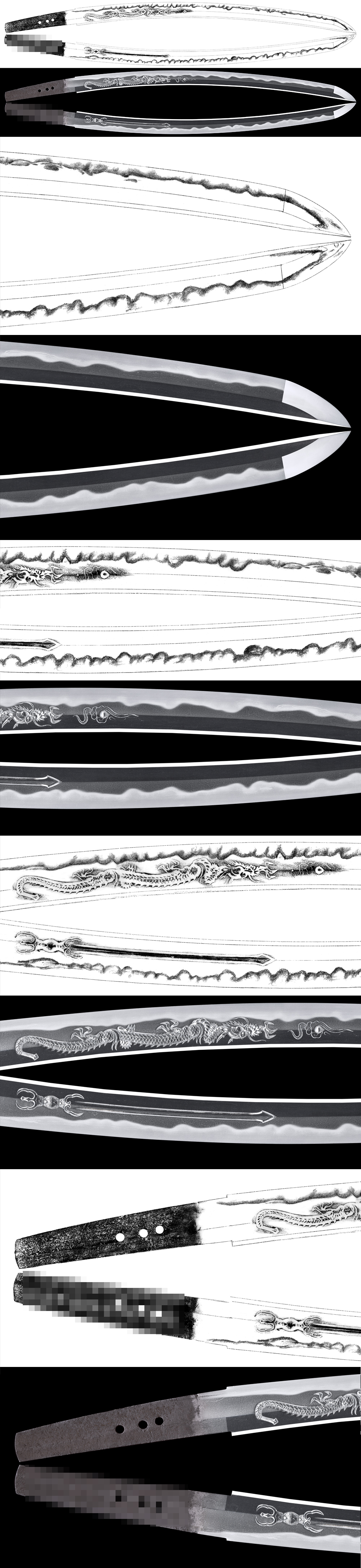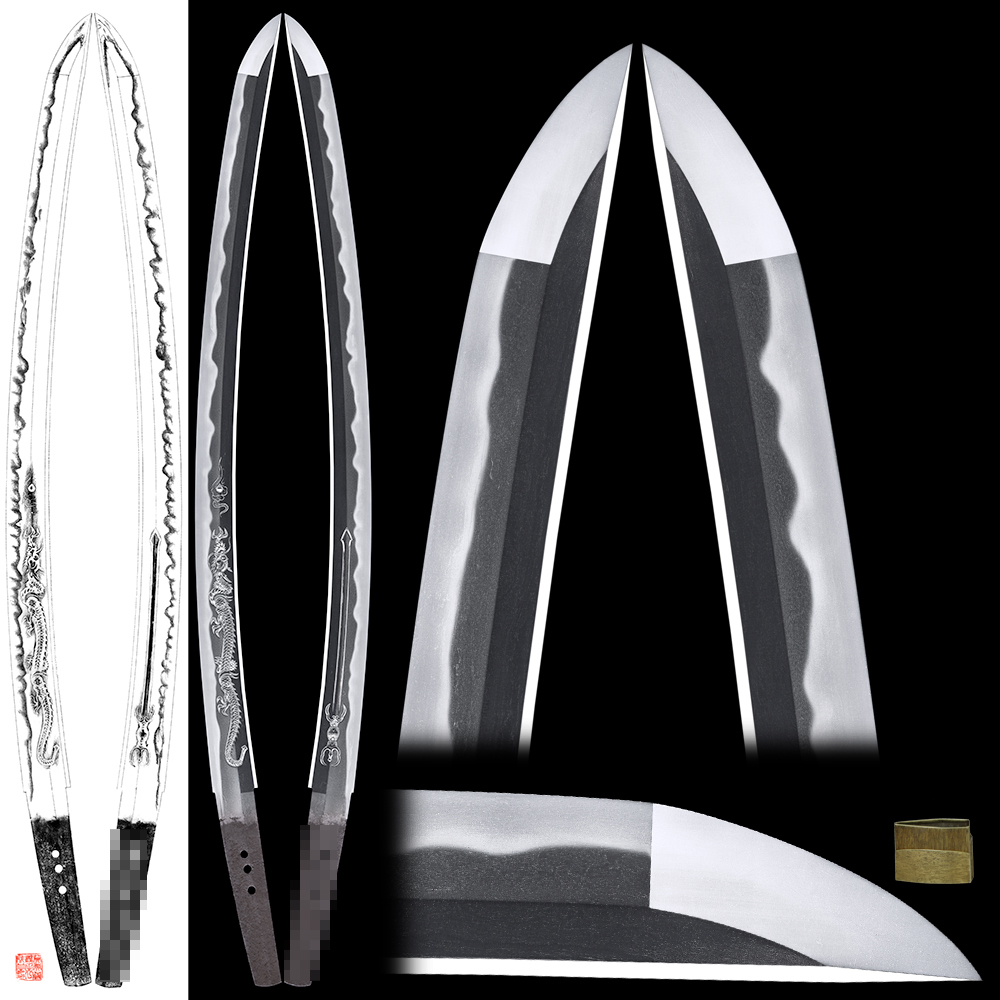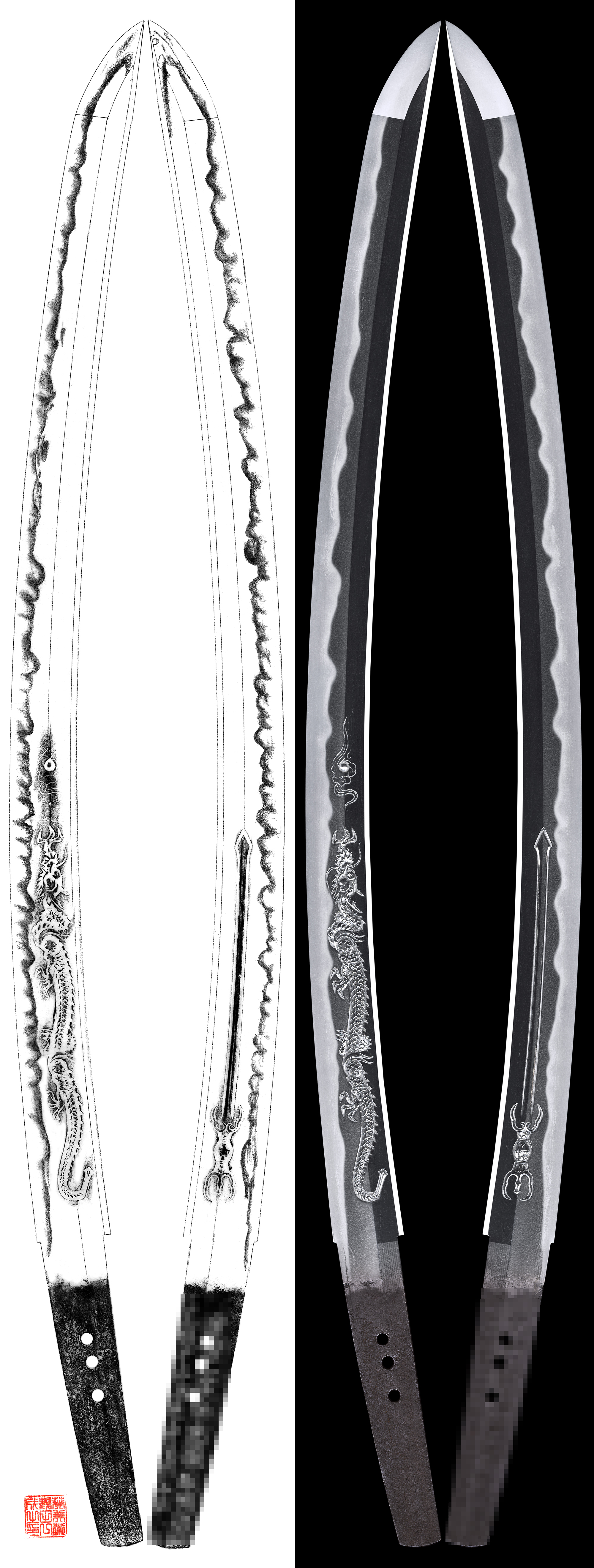 On the Jigane, a doragon and Dokko Ken are engraved deep horimono.