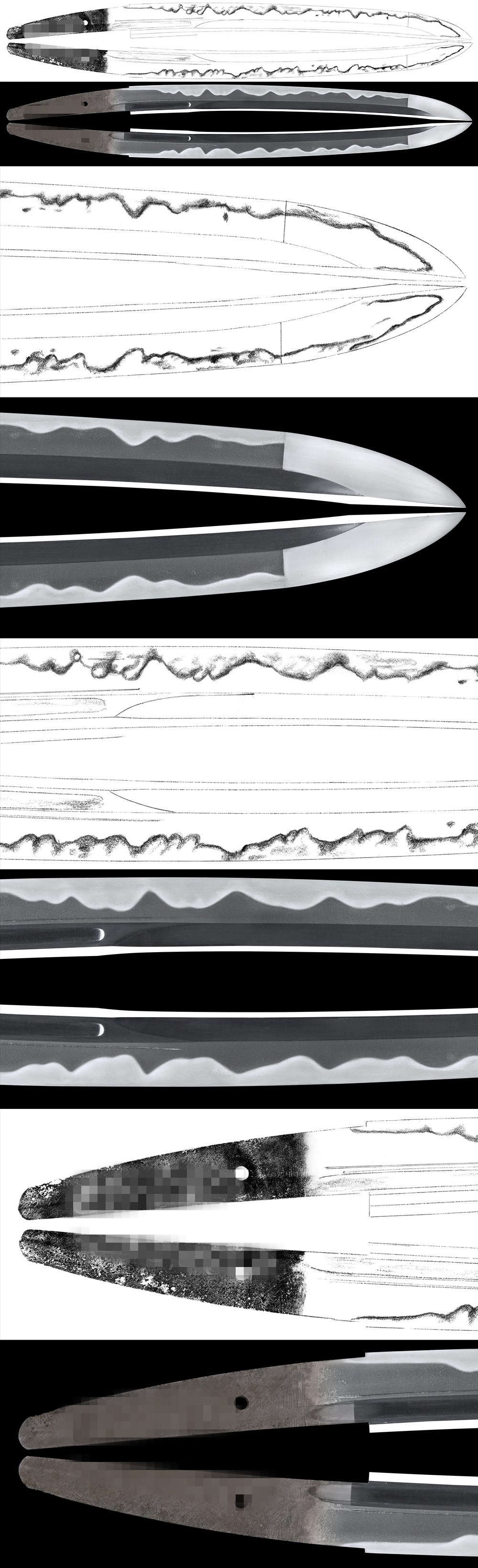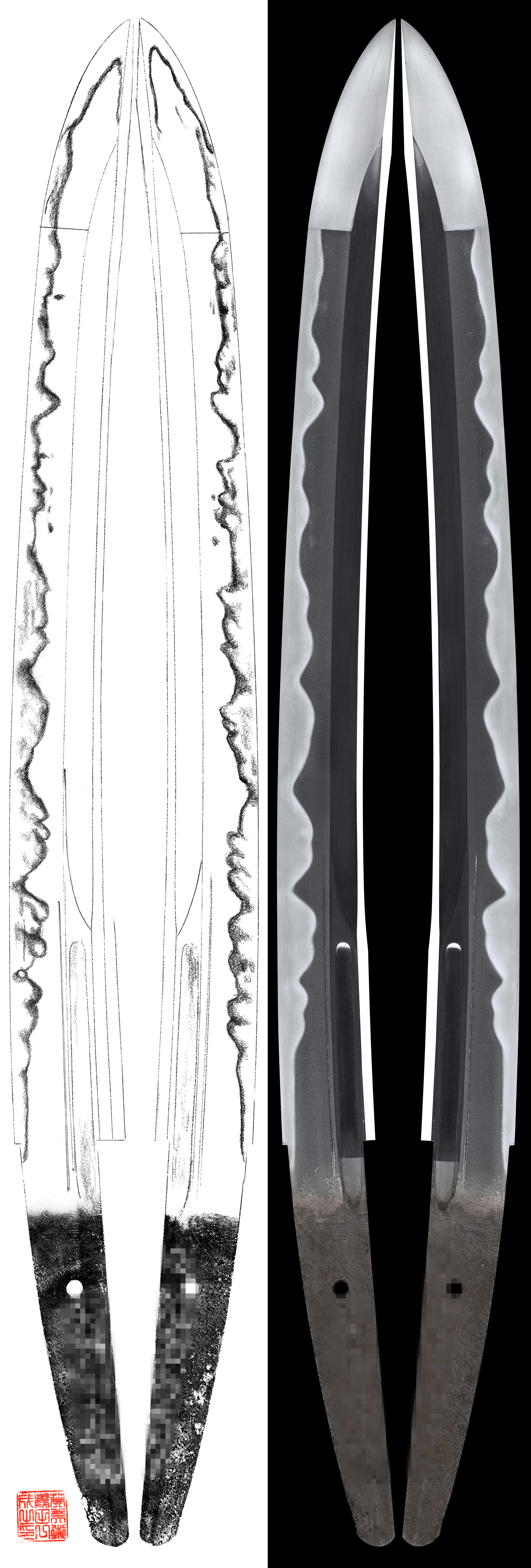 Shape : Wide and thick Wakizashi. There are Bo-Hi, Koshi-Hi and Soe-Hi on both side.