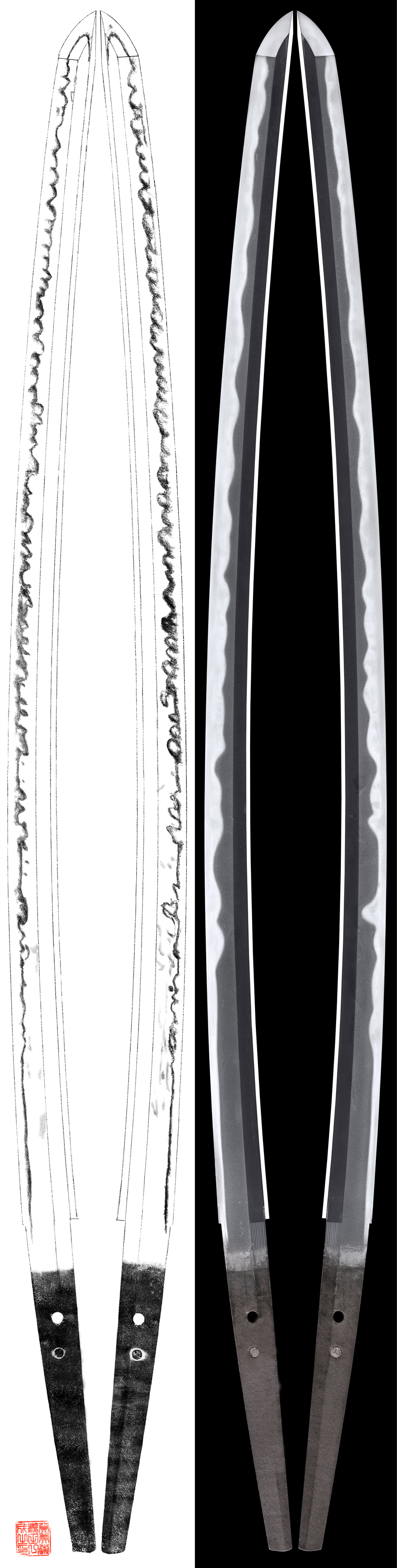 4:Hamon is Suguha and then active Gunome Midare with deep Nioikuchi and also Sunagashi, Kinsuji work. Boshi turns round shape.