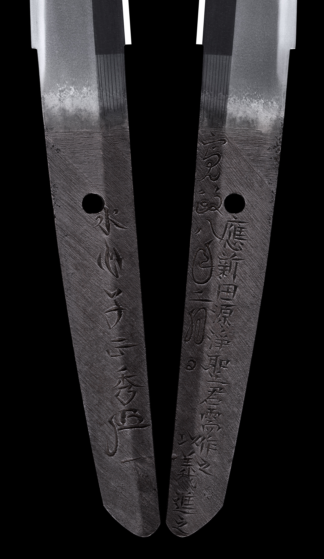 Special feature:uSuishinshi Masahide the First forged this wakizashi. It is an accepted theory that he was the founder of Shinshin-to. Masahide was born in Dewa province, present Yamagata pref. in 1750. It is said that he learned in his youth under Kunikane the Forth at Sendai or a smith forging farming tools. Masahide went to Edo and learned under Miyakawa Yoshihide, a swordsmith of Shitahara school on the introduction of a certain samurai at the age of 22. Masahide started serving the Akimoto family in 1774 and studied the method of forging sword from an independent standpoint. A daimyo; a feudal lord gave Masahide foreign steel called Namban-tetsu to study. On early works he was fond of brilliant Toran-ba modeled on Sukehiro that had a tendency to break so he tried to the revival of Koto blade forged in the Kamakura period aimed at the sharpness. He went to Edo in 1781and learned Bizen-den under Ishido Korekazu, Soshu-den under Tsunahiro. Masahide was also an educational swordsmith to discipline an array of excellent pupils; Taikei Naotane, Hosokawa Masayoshi, Chounsai Tsunatoshi and others.