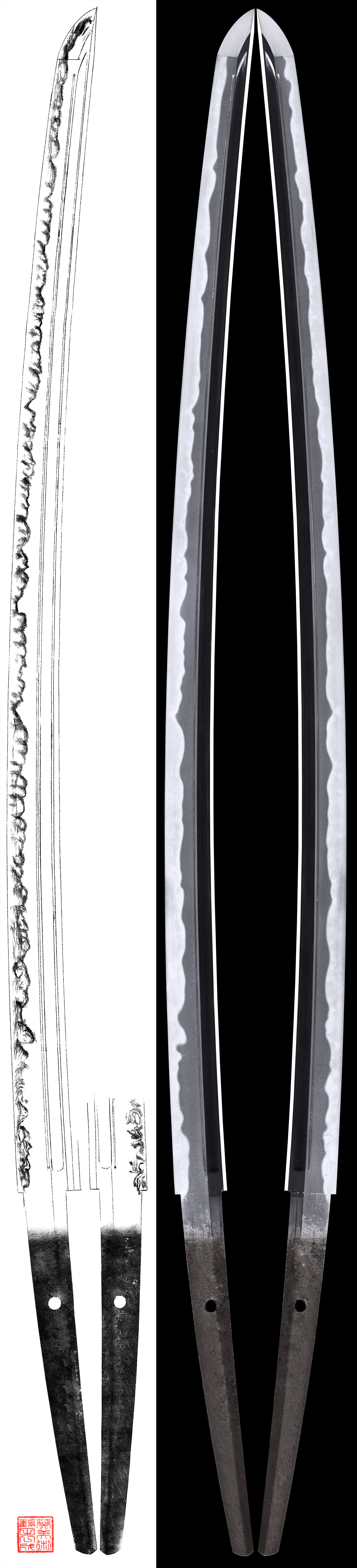 Shape : The blade is rather wide and thick with deep sori and longer kissaki