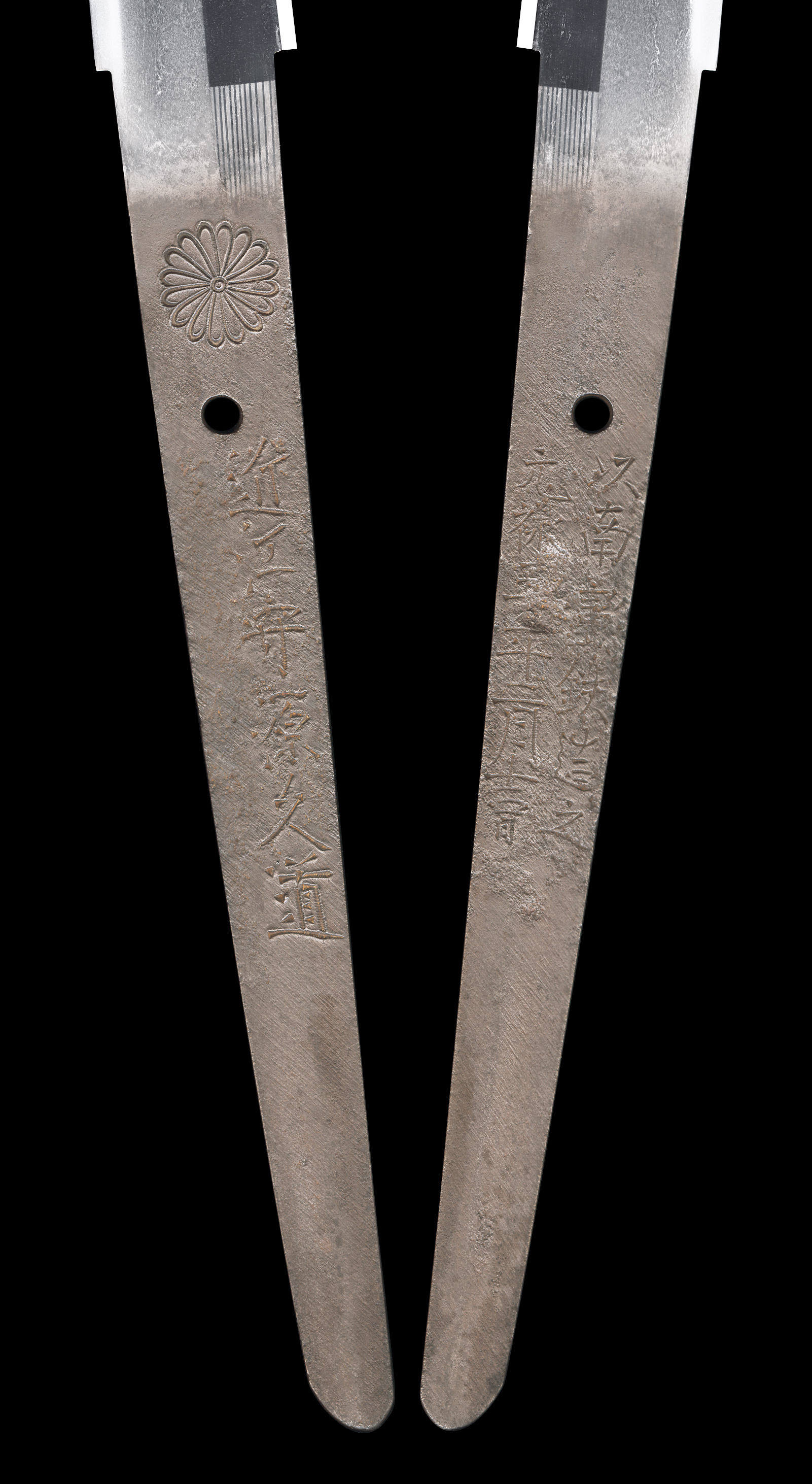 His master Iga Kami Kinmichi permitted to engrave Kikumon(family crest kiku family crest)on the tang.