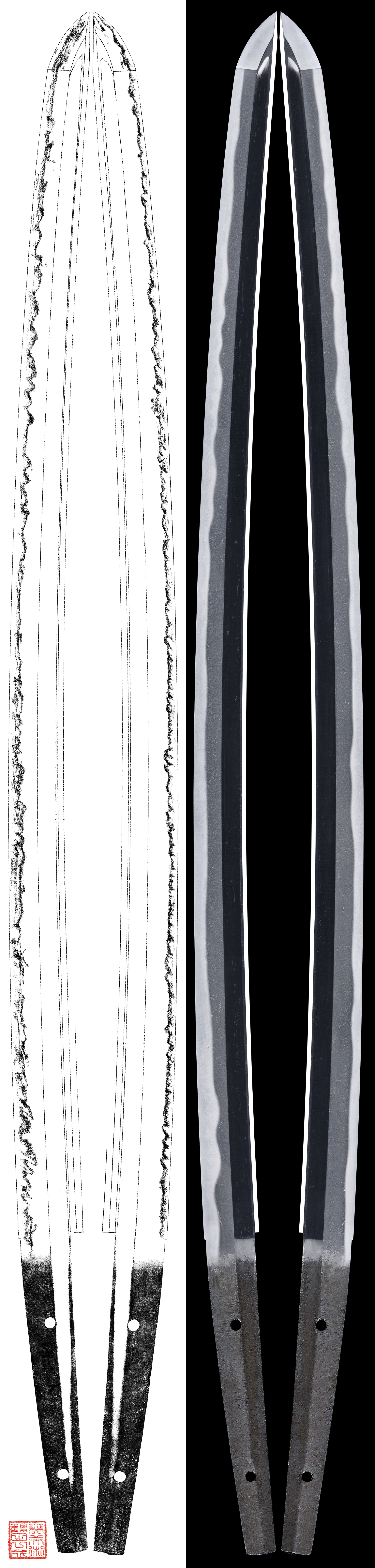 Hamon :Niedeki gunome midare with deep nioikuchi and small gunome midare mixed. In Hamon, there are sunagashi and kinsuji scatter.