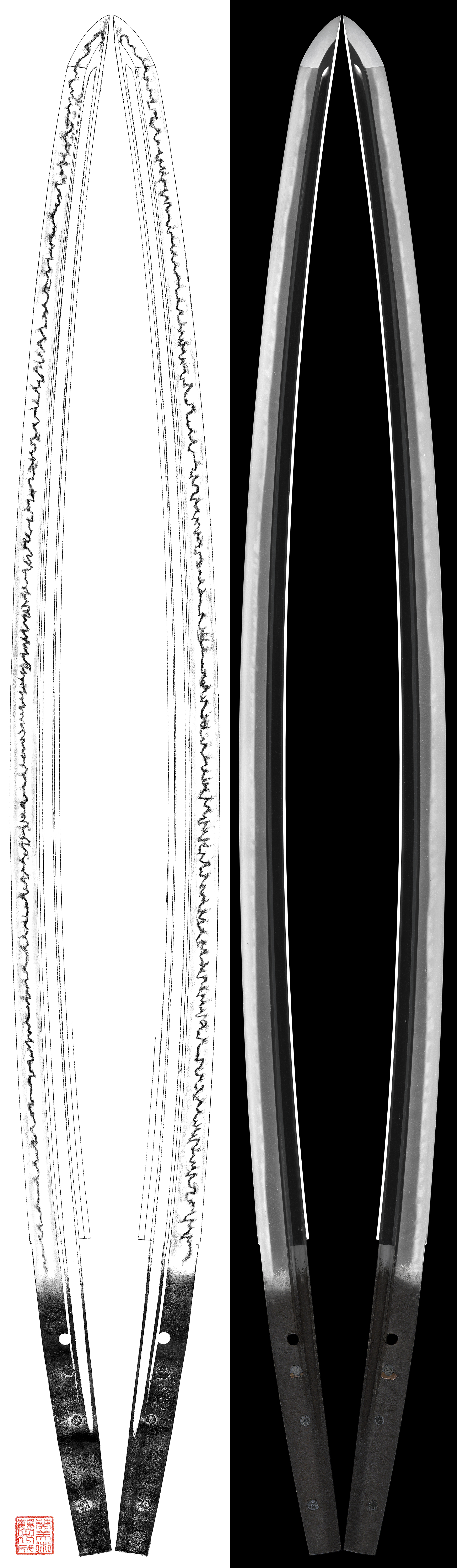 Shape : Oo suriage mumei, regular size with deep sori and longer kissaki. Bo-hi and Soebi are engraved on both side.