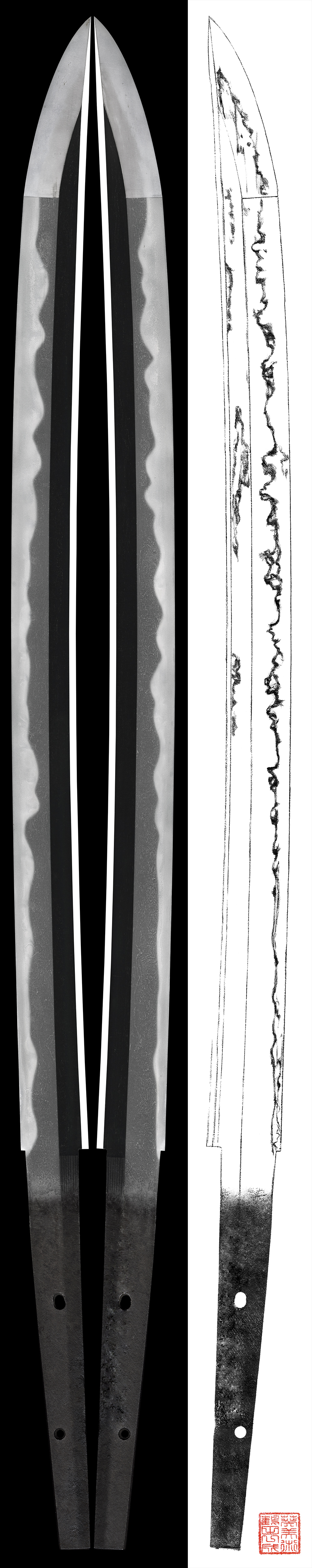 Shape : Wide and thick blade with small Sori. The Kissaki is O-Kissaki.