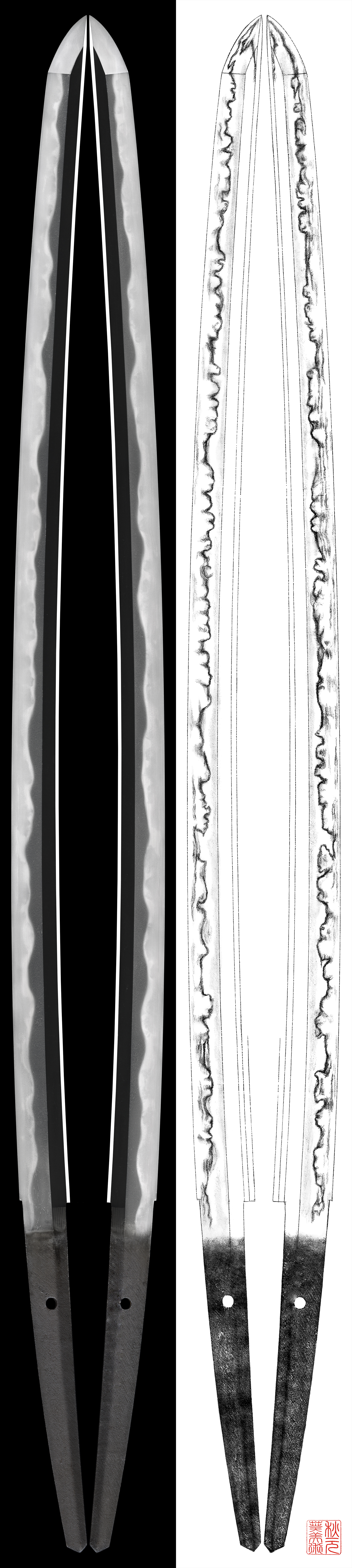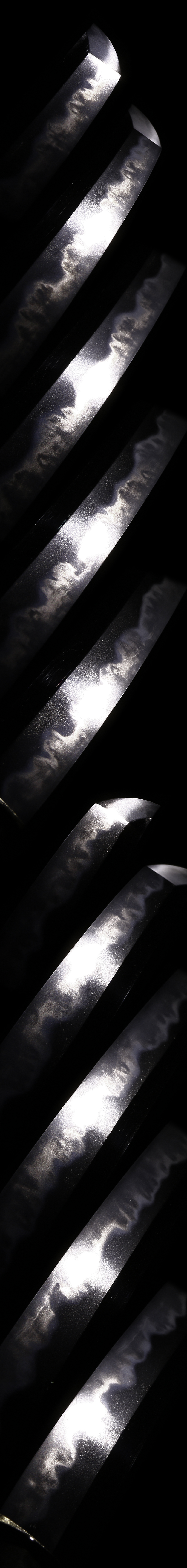 Hamon : Nie Deki, Gunome Midare with thick Nioikuchi. Also the mixture of O-Gunome Midare and Choji Midare. In the Ha, there are Sunagashi, Kinsuji, Yo, and Ashi.