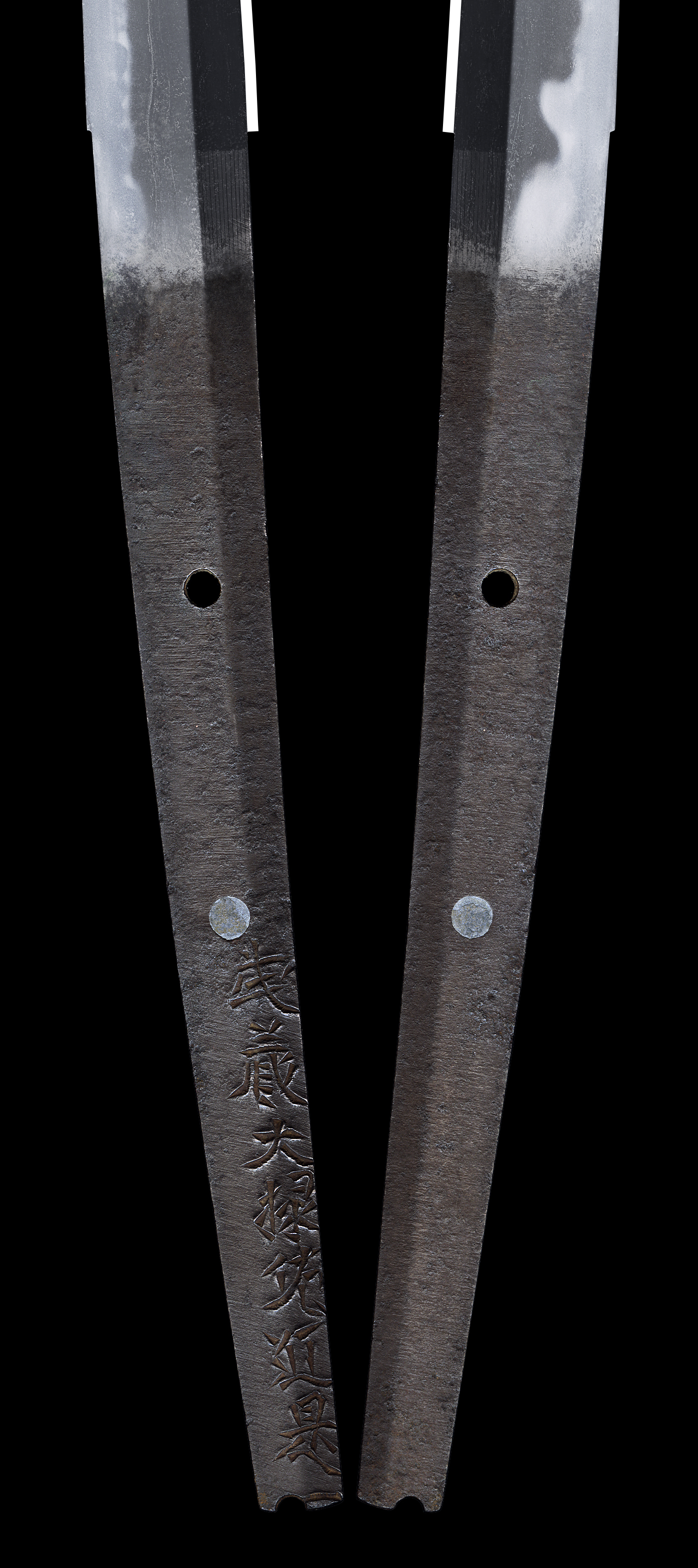 Shape : This sword is rather heavy with Ubu style one hole mekugi ana The blade is rather wide and thick with deep sori and long Kissaki nice looking shape.