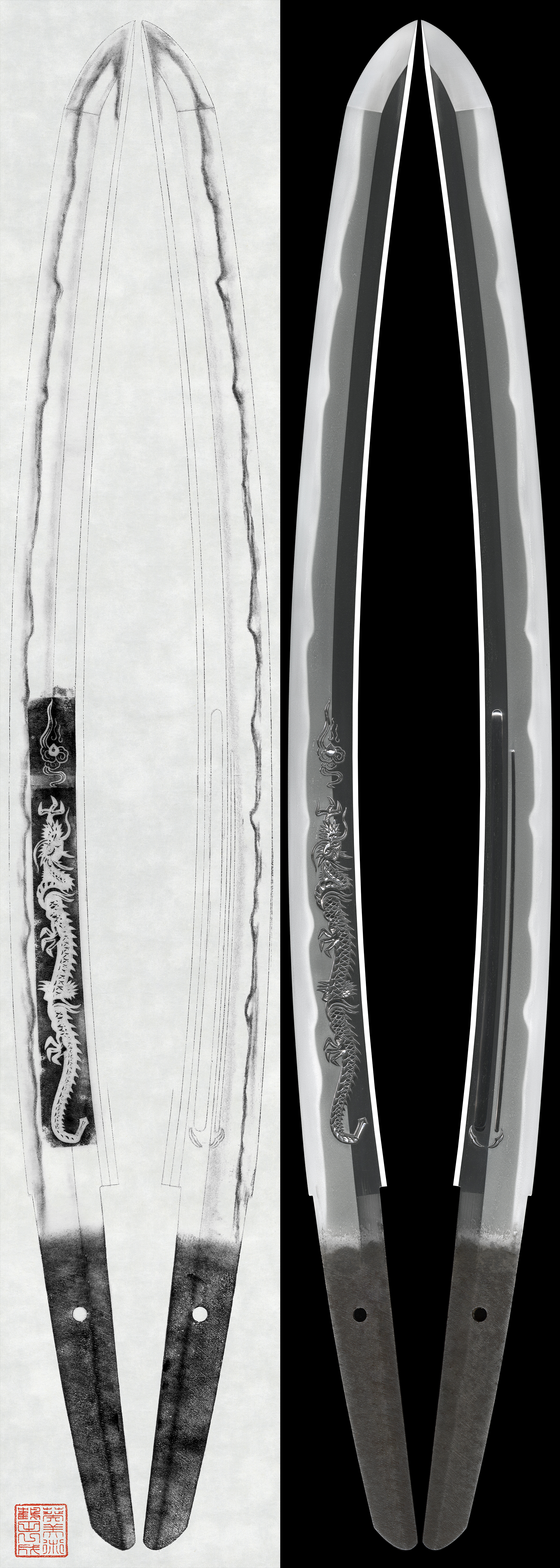 Shape:The blade is wide and thick, has deep Sori with long Kissaki.