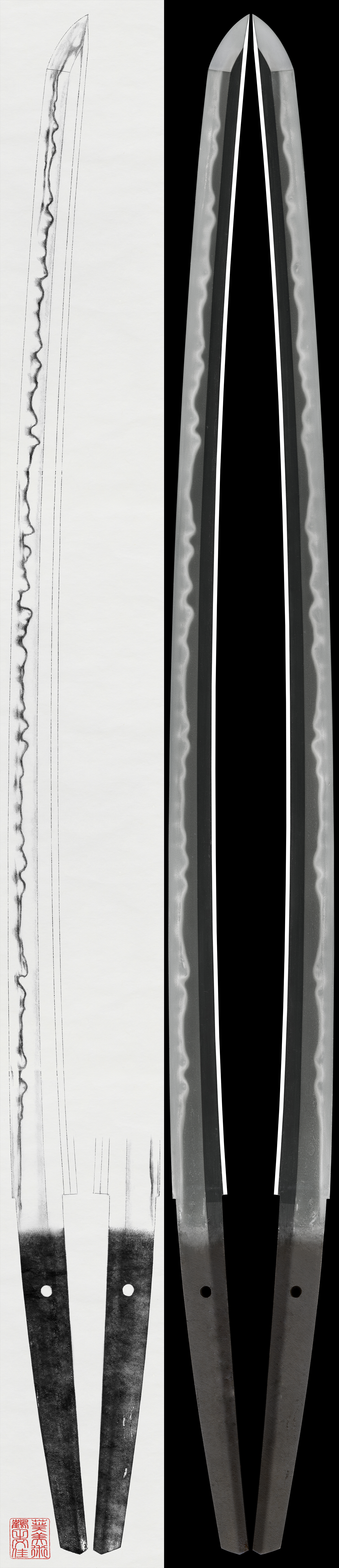 Hamon: Niedeki, from Hamachi, Niedeki Suguha then deep Nioikuchi Gunome-Midare.
