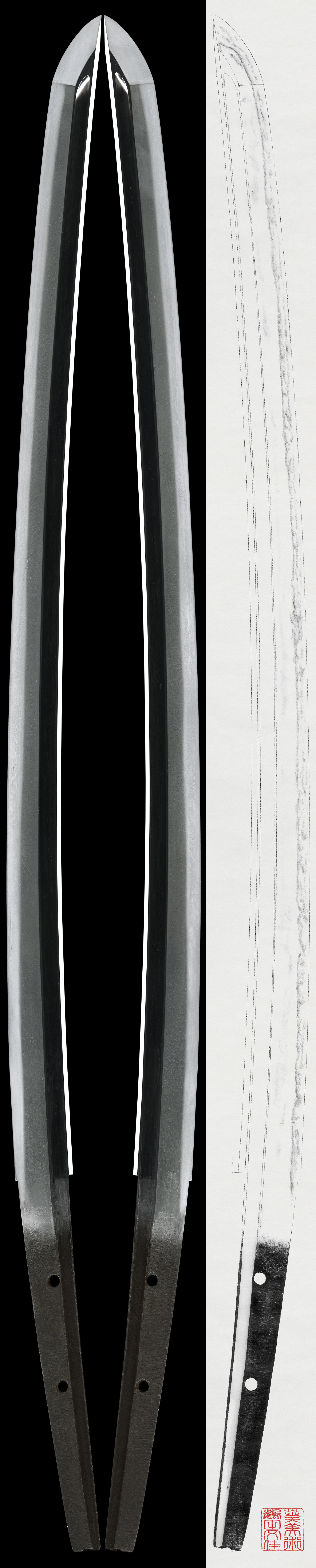Shape: Osuriage. The blade is broad and thick with Sori and Bohi on both sides.