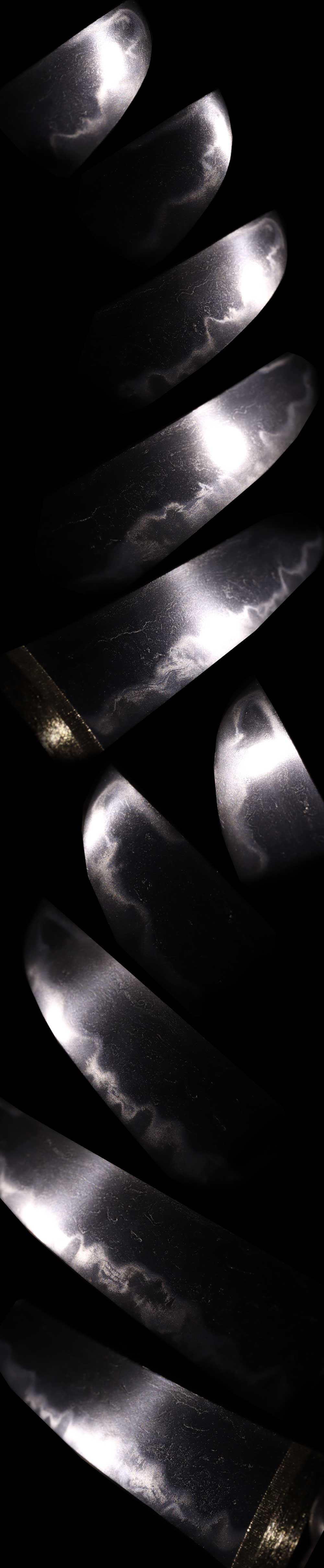 Jigane : Itame is mixed with Mokume with lots of thick Jinie. It flows partially and becomes rough with Chikei. Blackish Jigane.