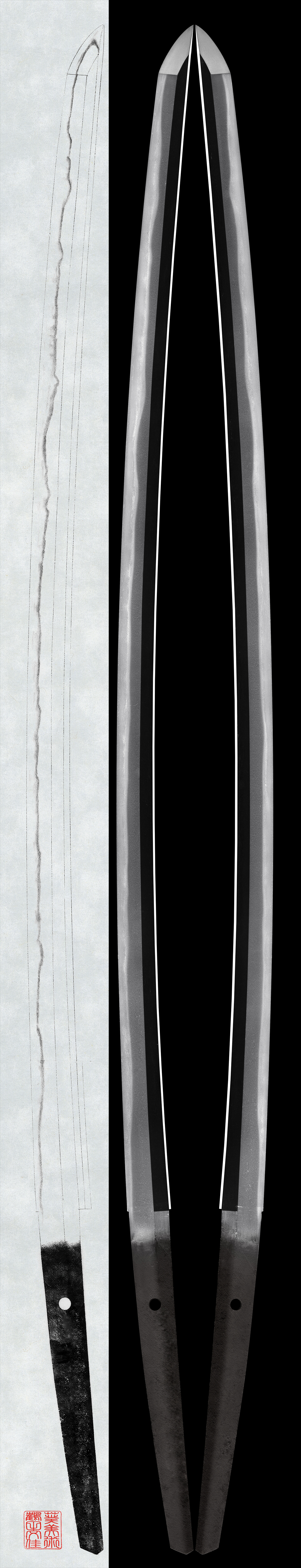 Hamon: Mainly Suguha, becoming like Notare, with slightly deep Nioikuchi. Ashi and Yo come in slowly. Boshi turns back round and the tip ends with Hakikake.