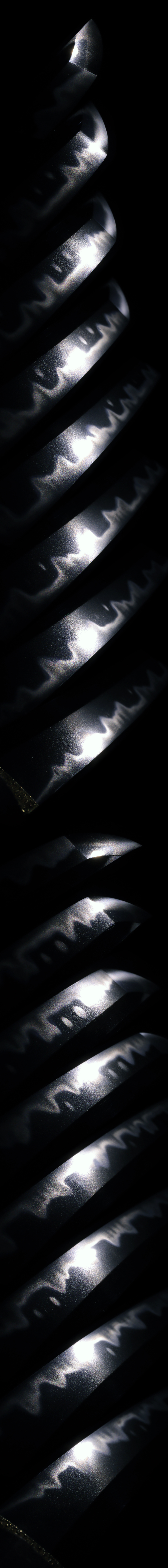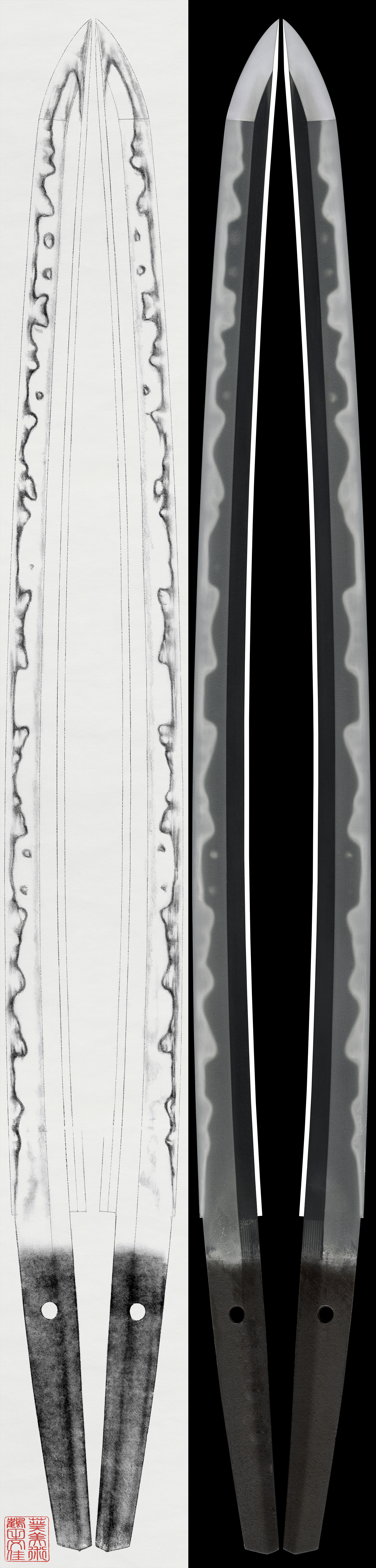 Rounded ball Hamon and becomes bright. Boshi has deep Nioikuchiand the tip gets sharper and turns back deeply. Sunagashi and Kinsuji work in Ha.