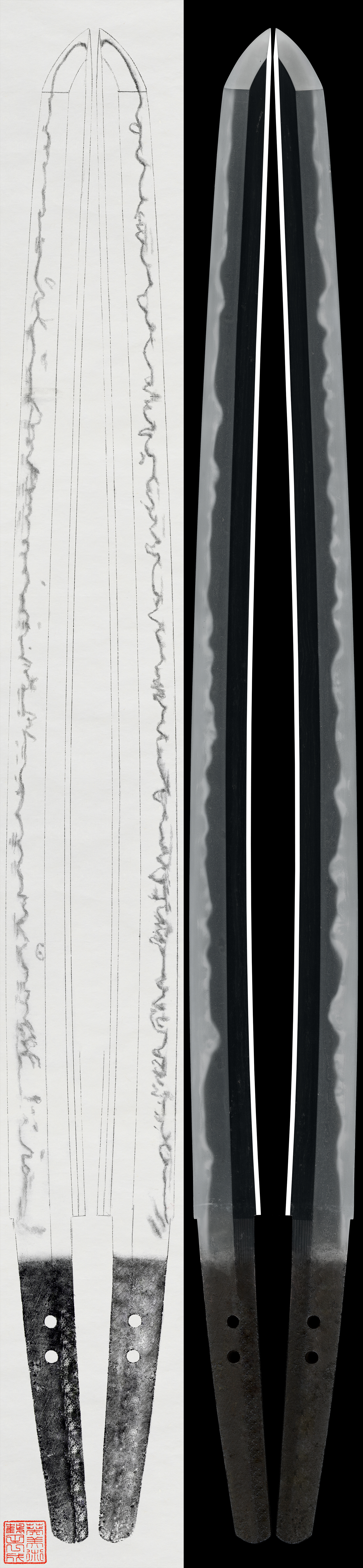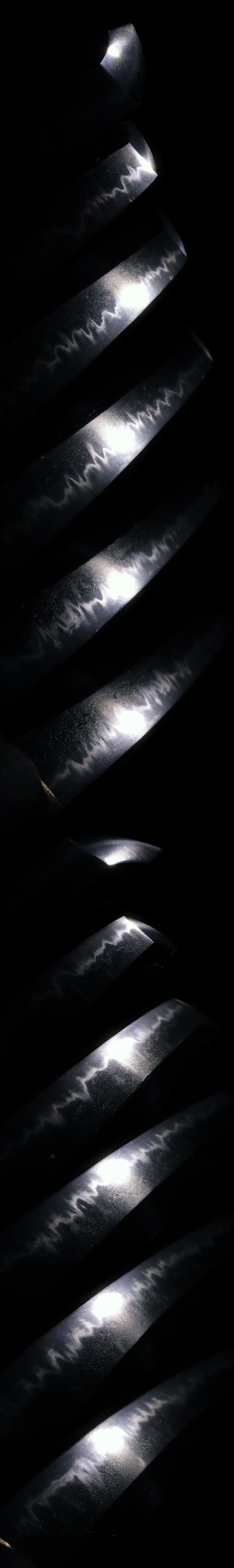 Hamon: Niedeki Gunomemidare with deep Nioikuchi. Sunagashi and Kinsuji work in Ha. Tobiyaki comes in. Boshi turns back round.