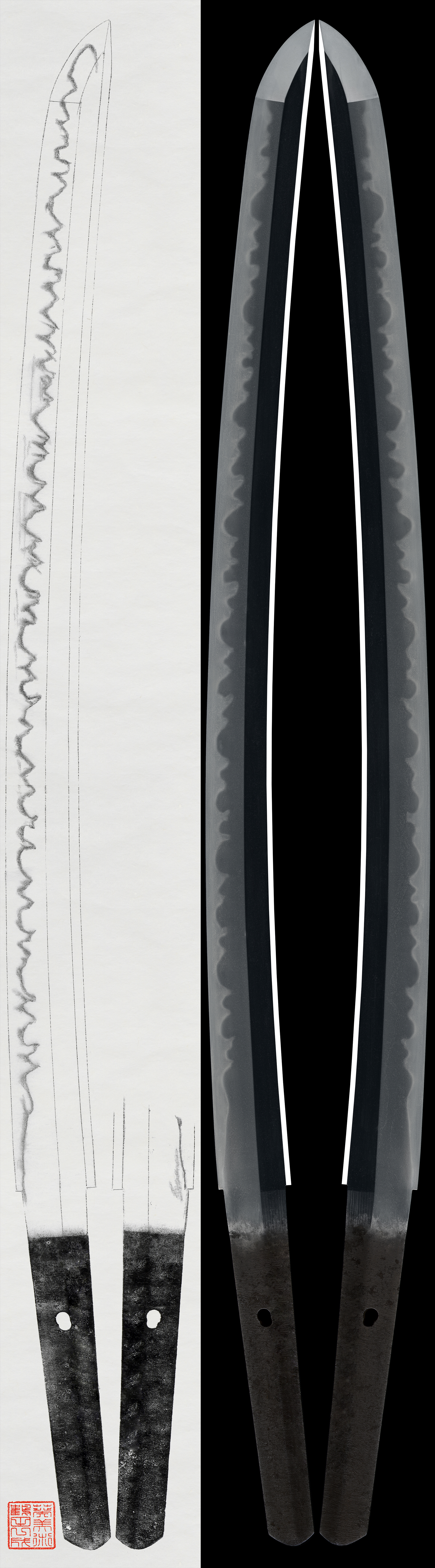 Shape: The blade is broad and thick with adequate Sori and longer Kissaki. The blade is