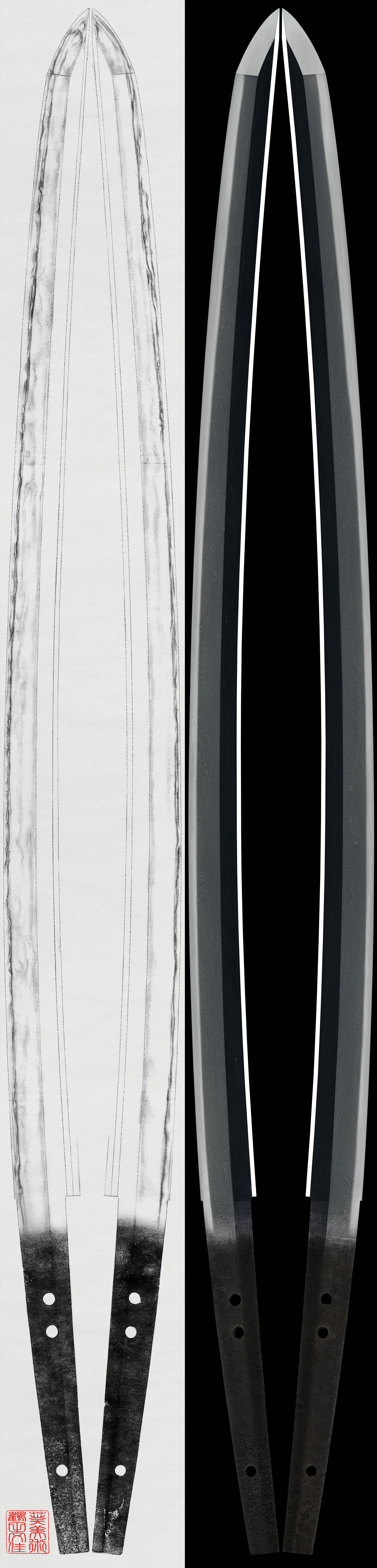 The blade has slightly deep Sori and longer Kissaki. Well-shaped work.
