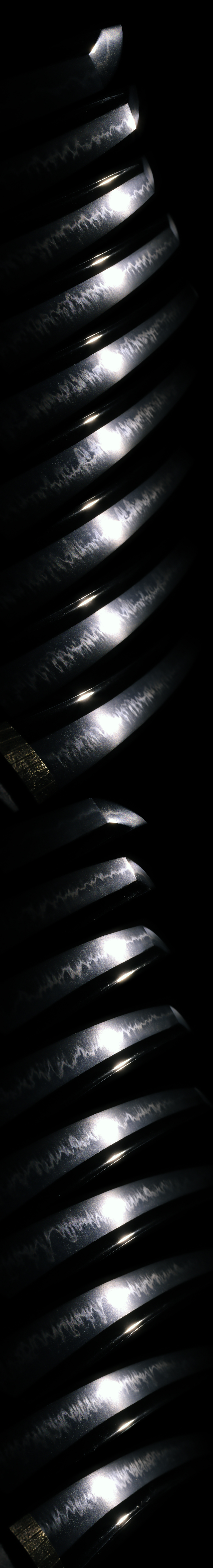 Hamon: Nioideki Chojimidare works well with lots of Koashi. The tip is a little bit calm. Boshi is Midarekomi and turns back in a small circle.
