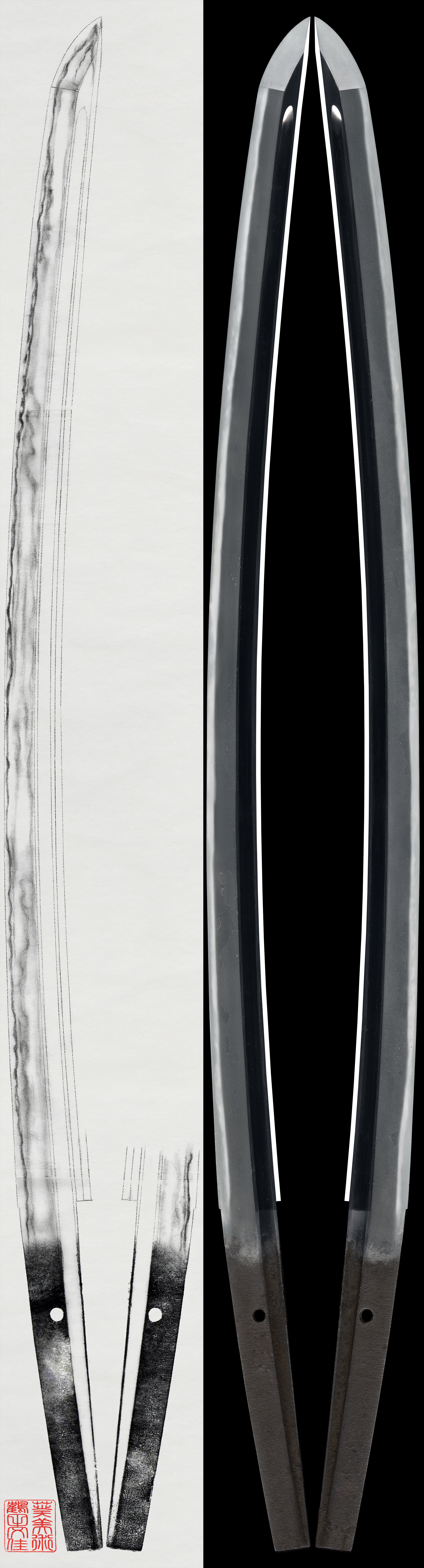 Shape: Osuriage Mumei. The blade is suitably broad and thick with Bohi on both sides