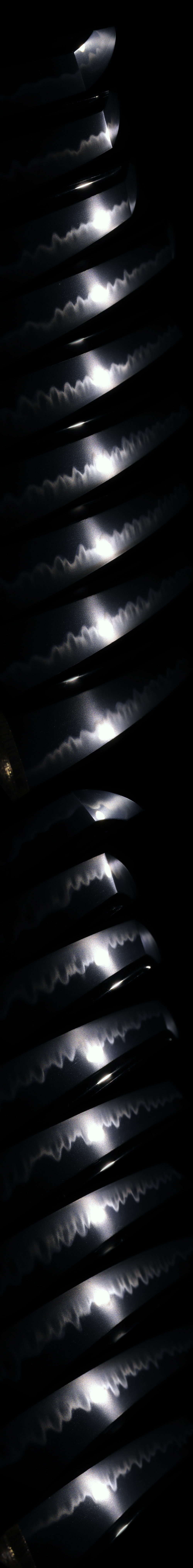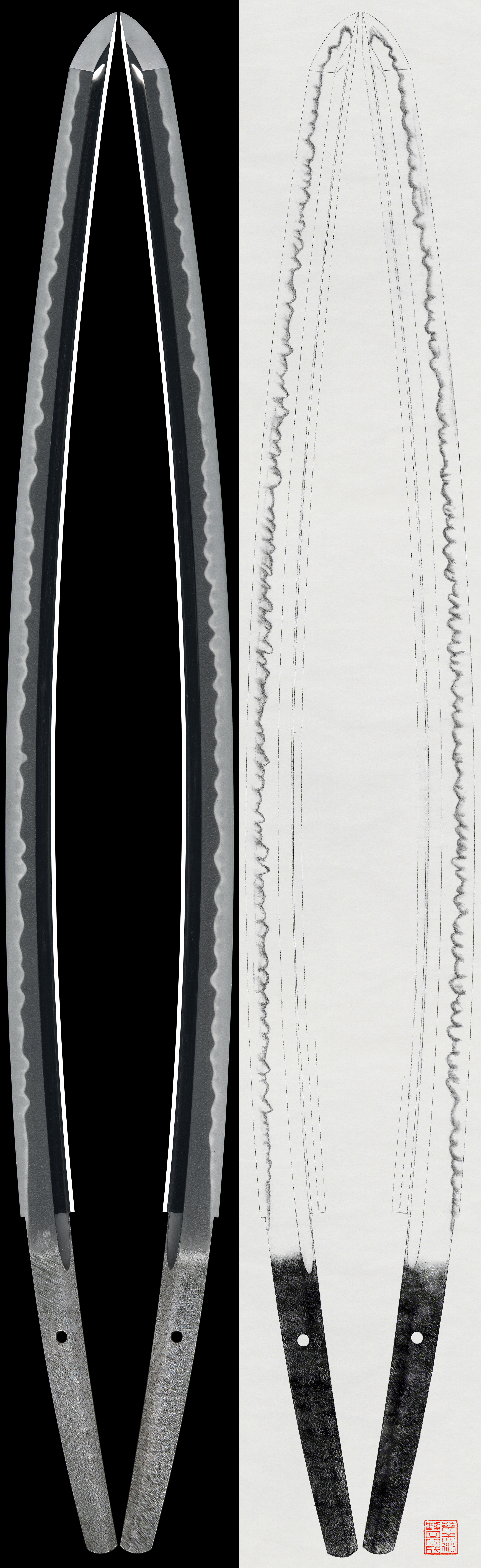 Hamon (temper line): Irregular gunome midare (undulating irregular waves) pattern, showing deep