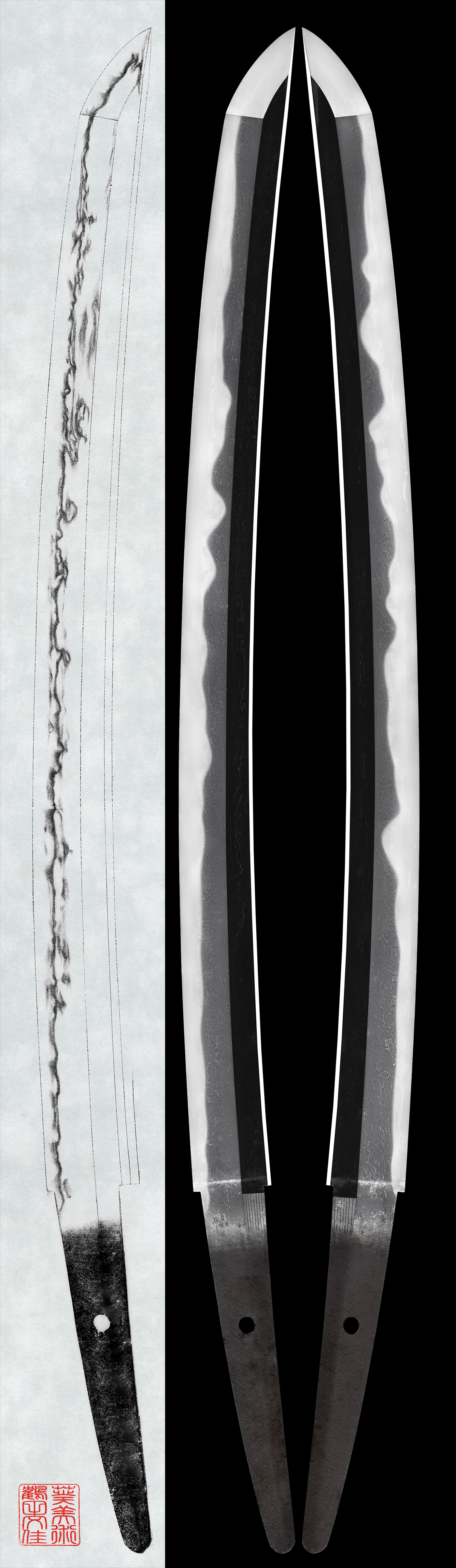 Nikuoki(thickness of the blade at the back), and a slightly deep curve with an extended kissaki (point). It exhibits a well-balanced form.