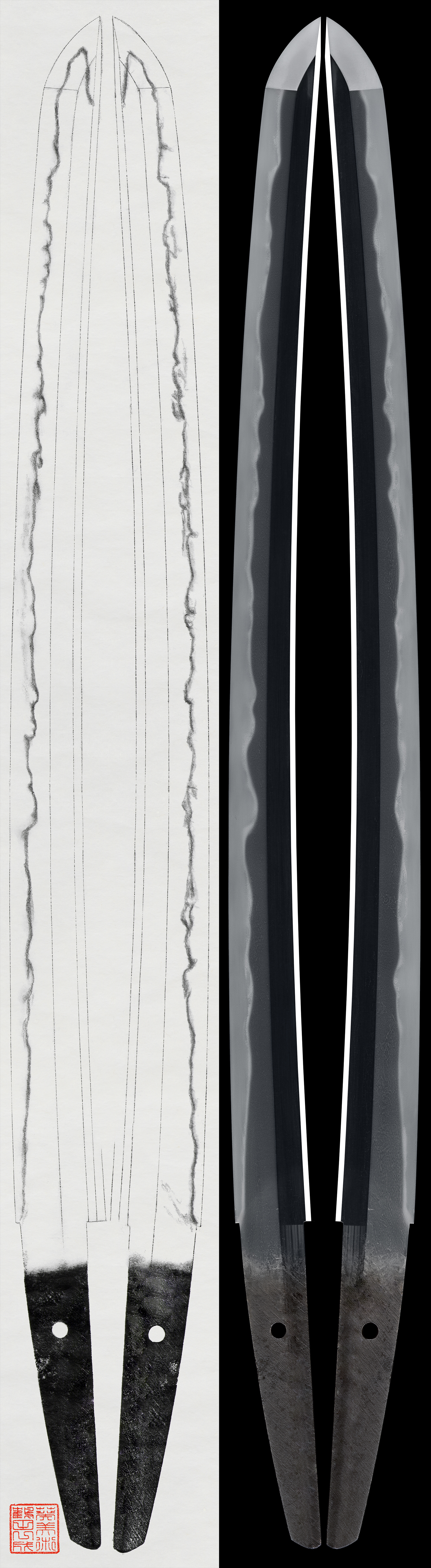 Shape: The work has a broad body and shallow curvature, with a slightly extended kissaki, making for a well-proportioned shape with beautiful jigane.