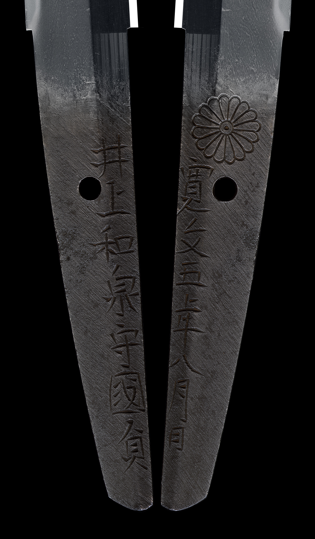 Features: This Inoue Shinkai is a work from the fifth year of Kanbun, changing its signature to Inoue Shinkai in the second year of Enpo. Because the first generation Kunisada became elderly, early productions were assisted by Izuminokami Kunisada as substitute. Around the fourth year of Manji, a sword was dedicated to the imperial court, and as a reward, he was granted the chrysanthemum crest, initially signing as Izuminokami Kunisada and changing to Shinkai in August of the twelfth year of Kanbun. He passed away in November of the second year of Tenwa. Inoue Shinkai is equally celebrated alongside Tsuda Sukehiro, both swordsmiths highly regarded with some joint works between Sukehiro and Shinkai. Previously questioned or denied works have been recognized as authentic through research, highlighting the impact of their friendship on their creations. Generally, Sukehiro is known for dynamic wave patterns, while Shinkai for straight patterns with deep nioiguchi.