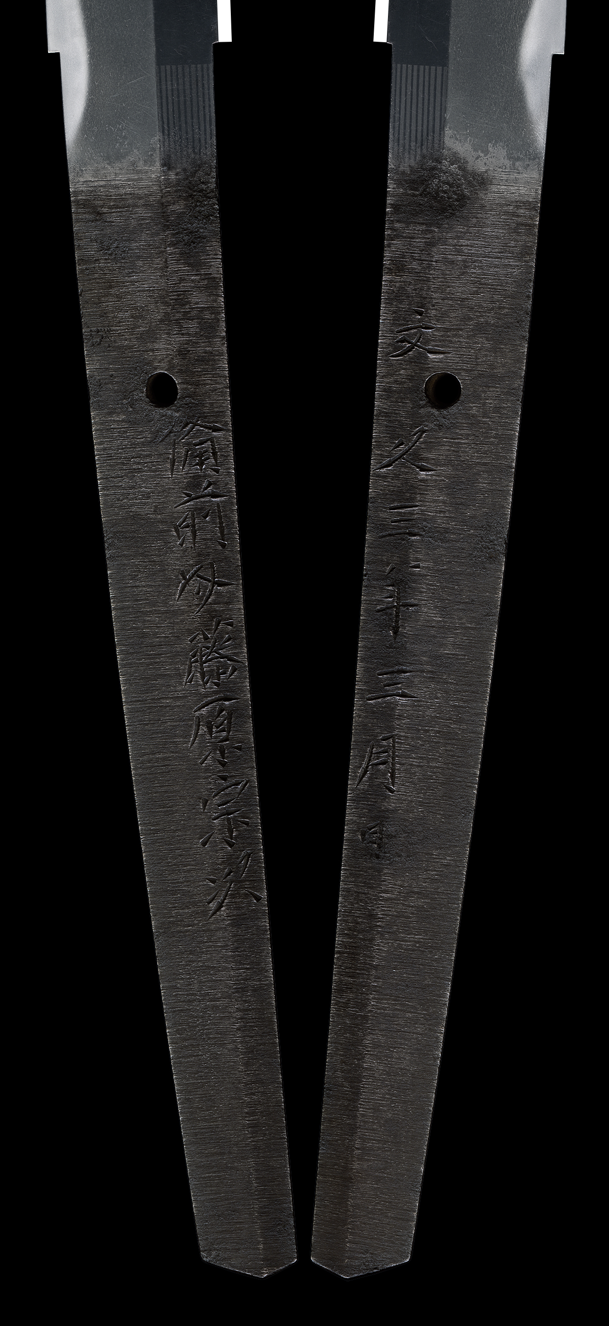Hamon: Nie-deki, a rounded gunome midare with small ashi, kozuka inclusions and sweeping small rounds toward the tip. Superior polishing accentuates the detailed masame hada and well-kneaded jigane. Sand streams and fine gold streaks are also visible within the blade.