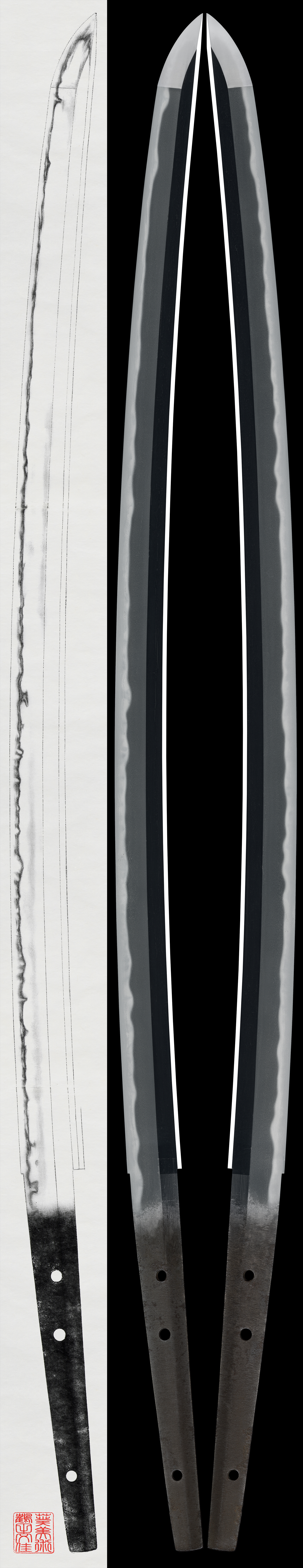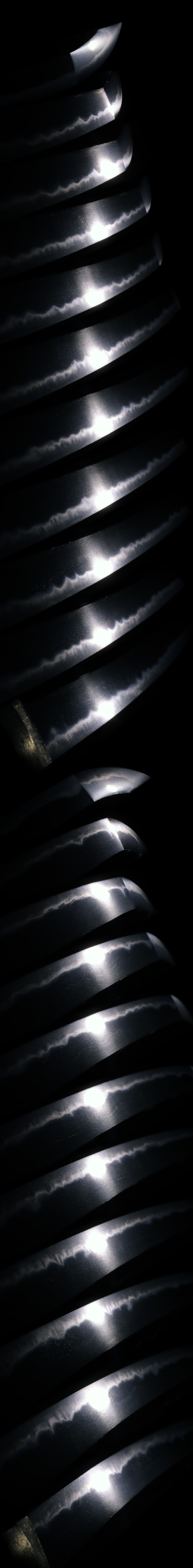 Shape: Wide and sturdy blade with deep curvature and an extended kissaki.