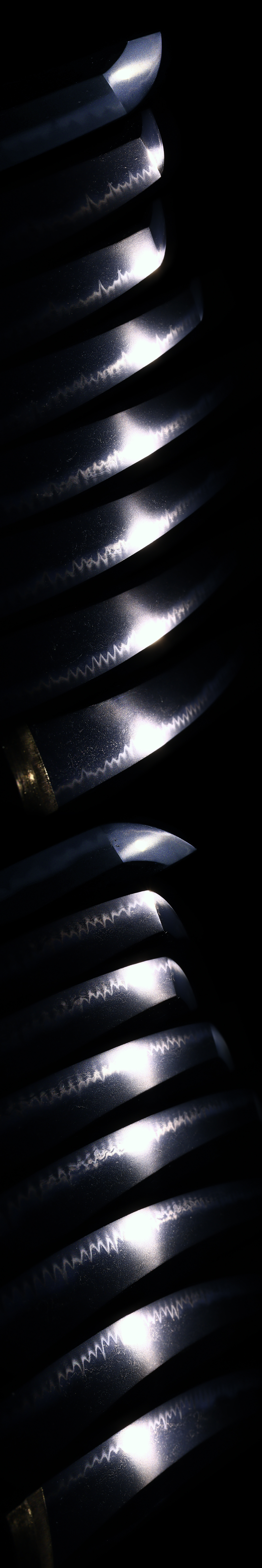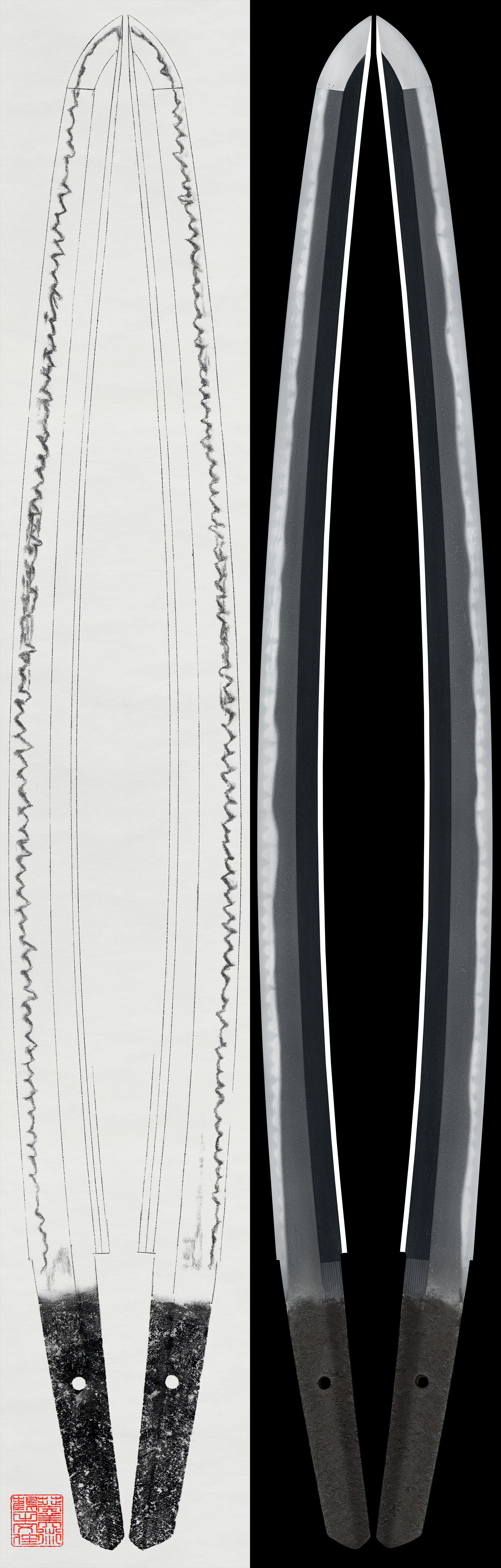 Hamon: The hamon consists of sharp-pointed sanbonsugi (three-cedar) in nie-deki, with streaks of kinsuji appearing intermittently.