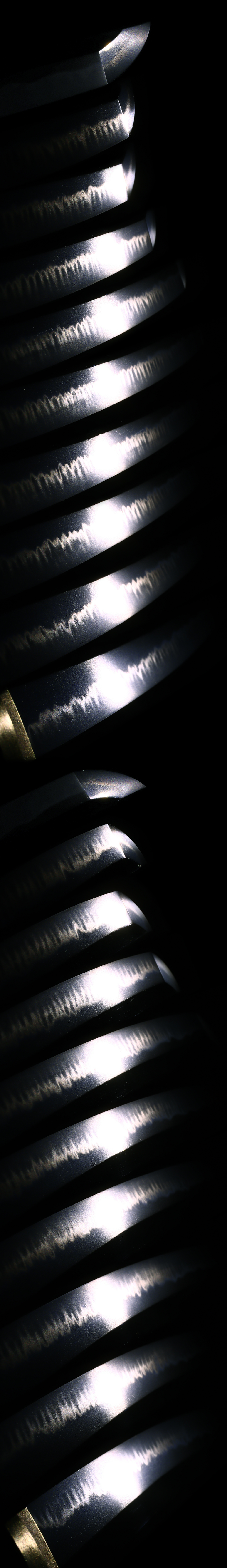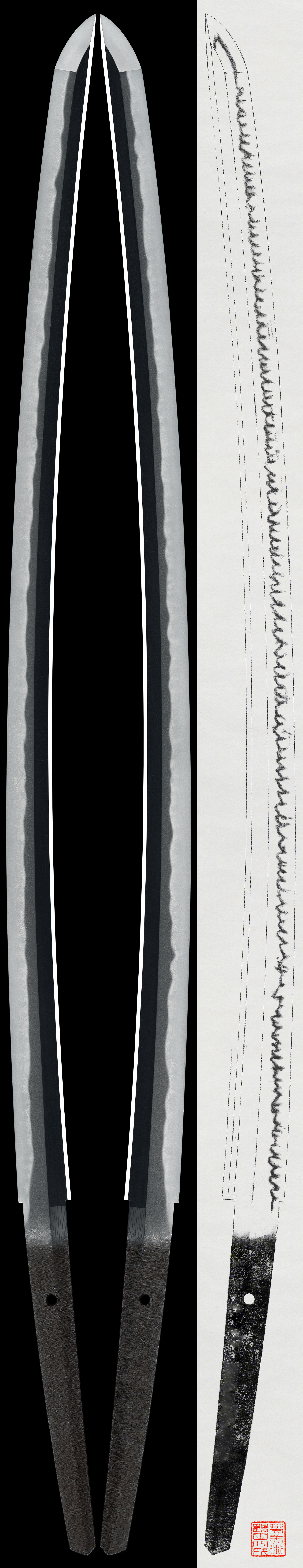 Shape: This katana has a wide mihaba, thick kasane, deep curvature, and an extended kissaki, showcasing a well-balanced form.