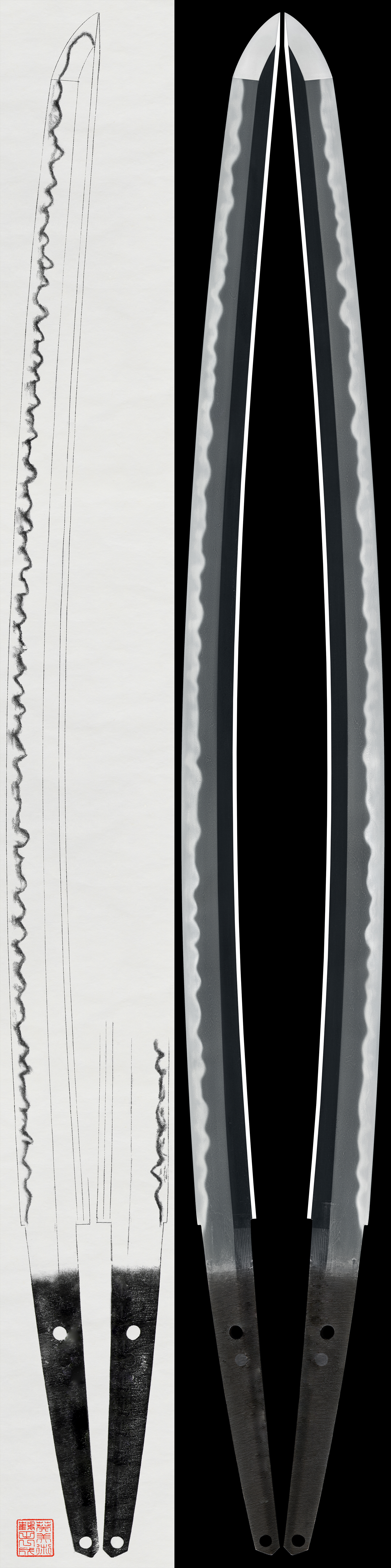 Shape: A robust blade with wide dimensions, deep curvature, and an extended kissaki, making it a healthy and impressive work.
