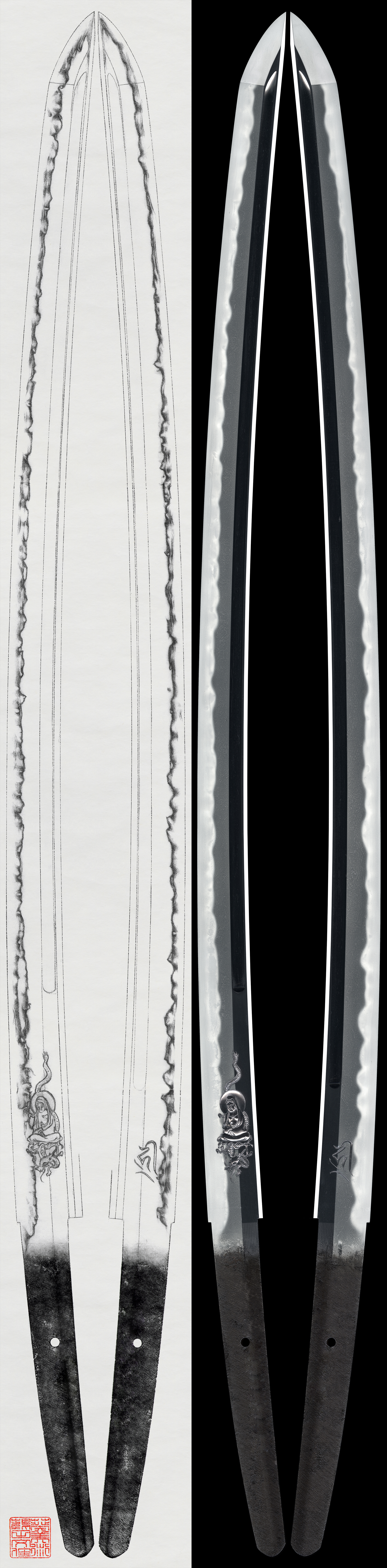 Both sides have a bohi groove, and near the base is a dense and skillfully carved horimono.