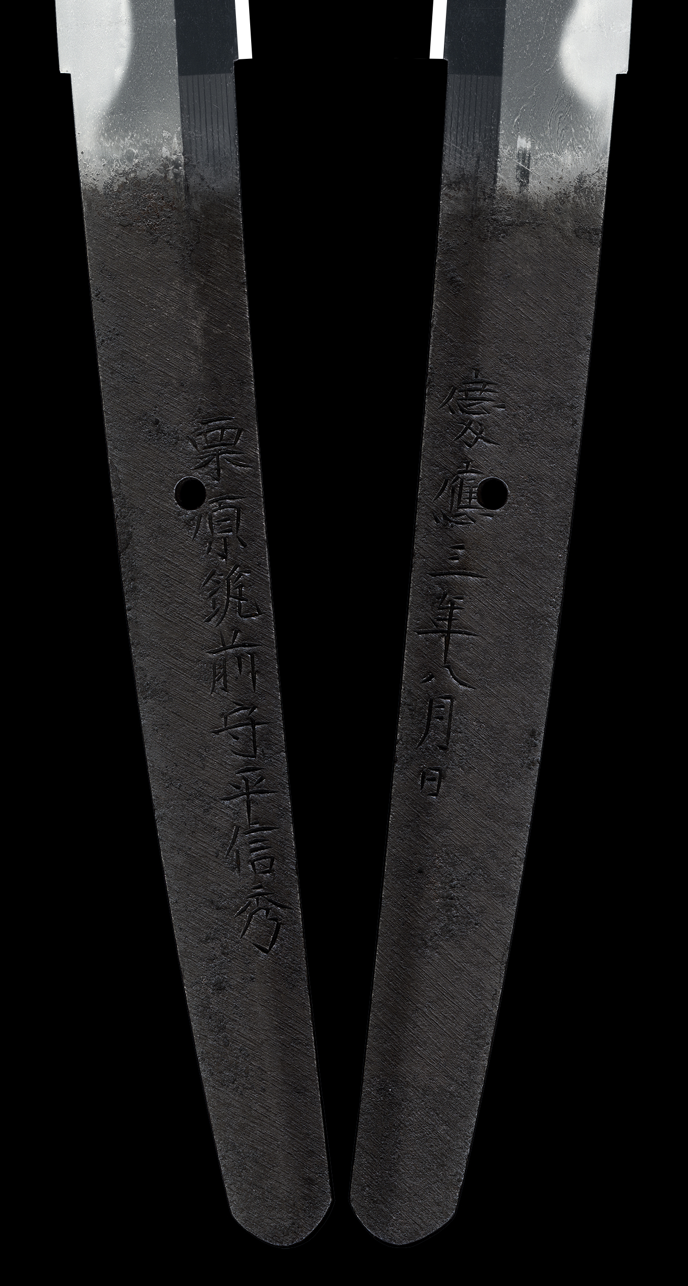 This sword is a fine example of his workmanship, with remarkable jihada and hamon, and carvings that exhibit Nobuhide’s unique style.