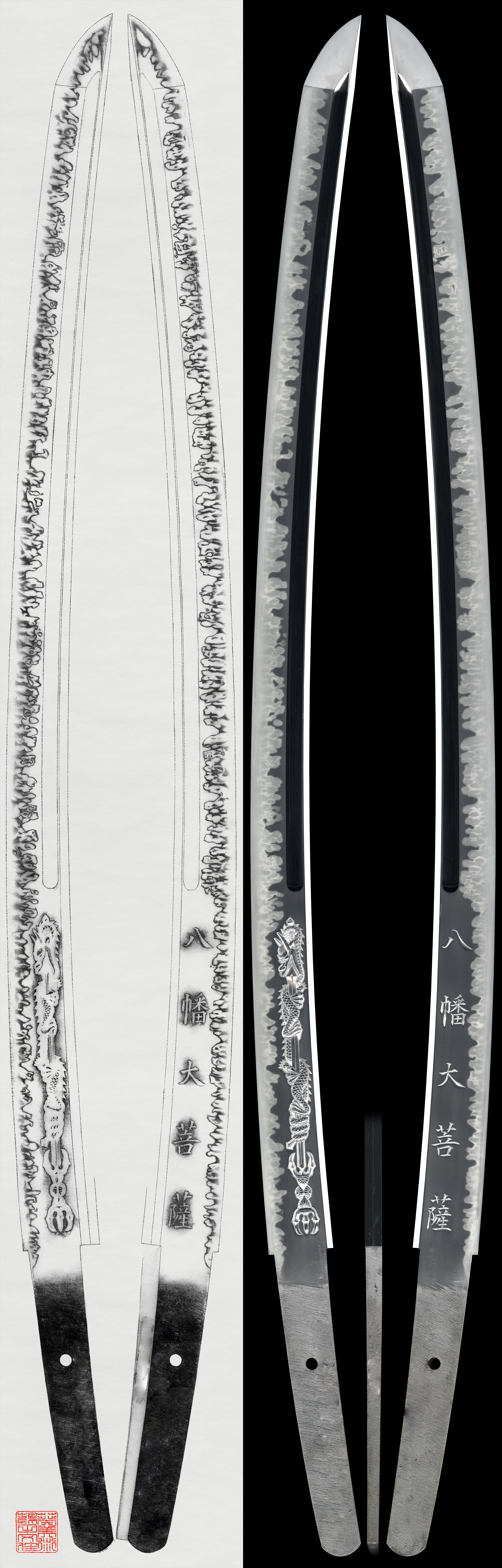 Hamon:From the Hamachi, the blade shows a spectacular "Ju-hana-choji" pattern, becoming more flamboyant as the carving ends. The boshi forms a brilliant and disorderly "Ju-hana-choji," marking this piece as a masterpiece.