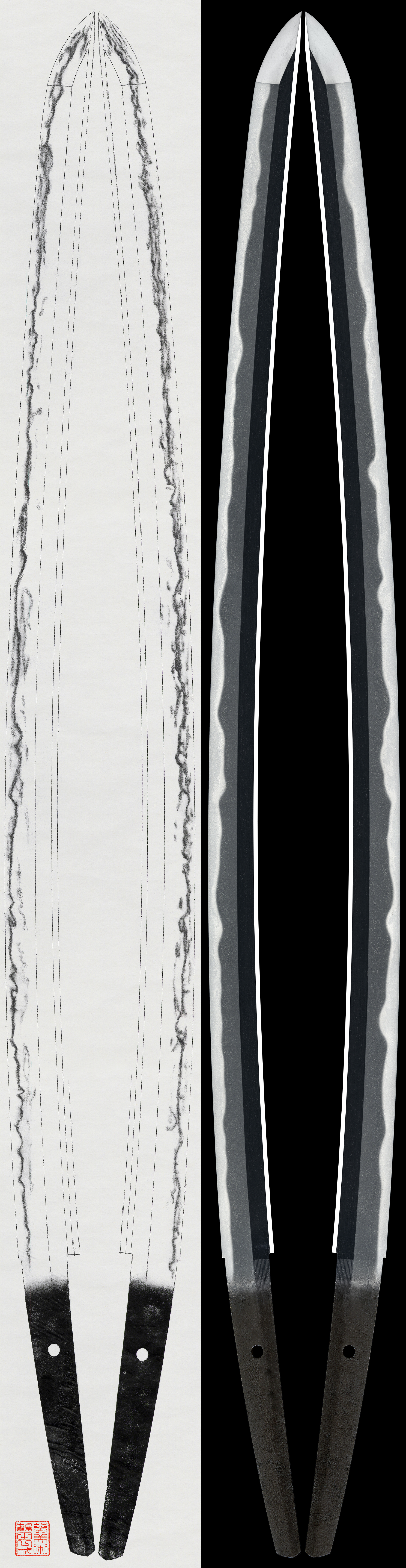 It has a strong thickness and deep curvature with a slightly forward curve and an extended medium kissaki.