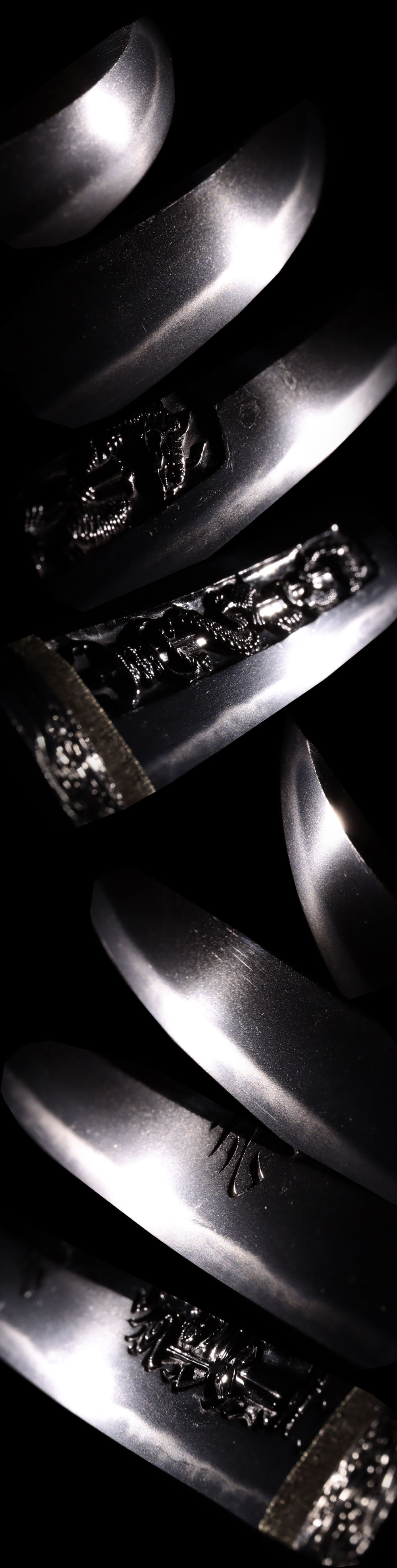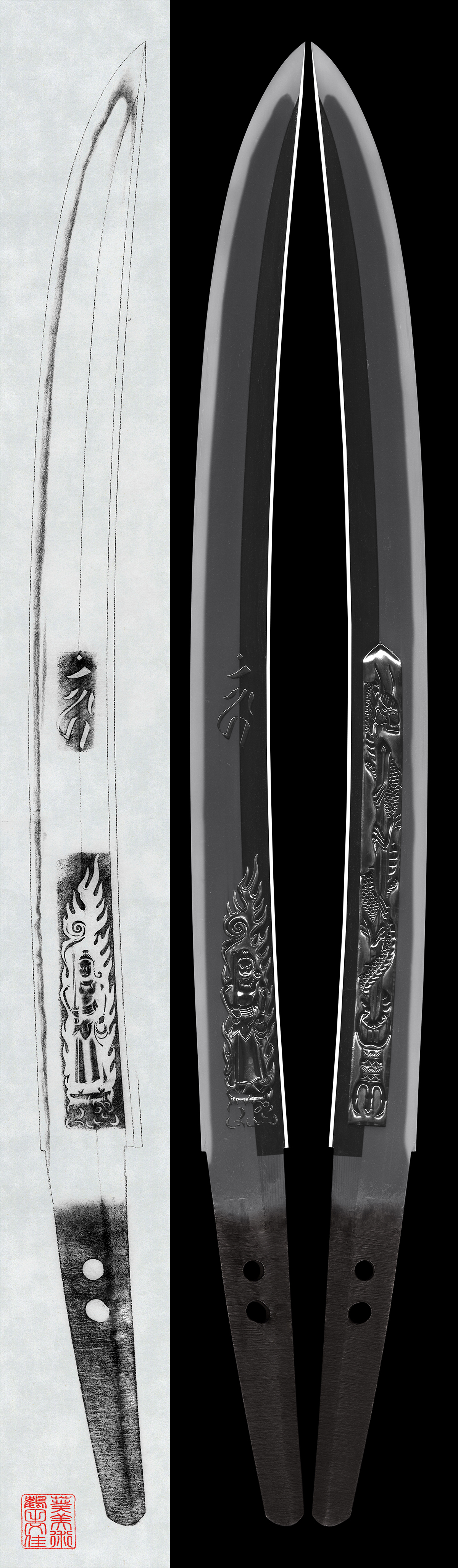 Made in shobu-zukuri style with high sori, carved with a splendid kaen Fudo Myo-o on both sides, and a kenmakiryū on the ura.