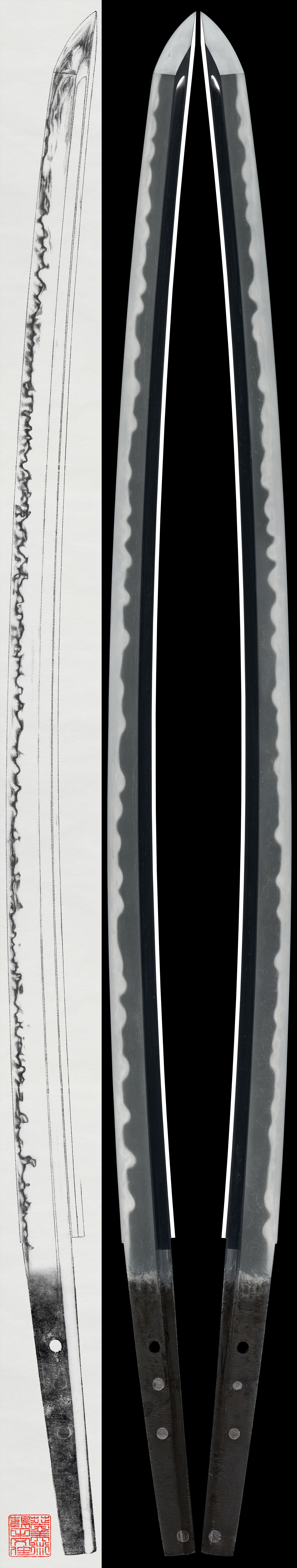 Hamon:Nie-deki gunome-midare with height variations, featuring kinsuji within the blade.