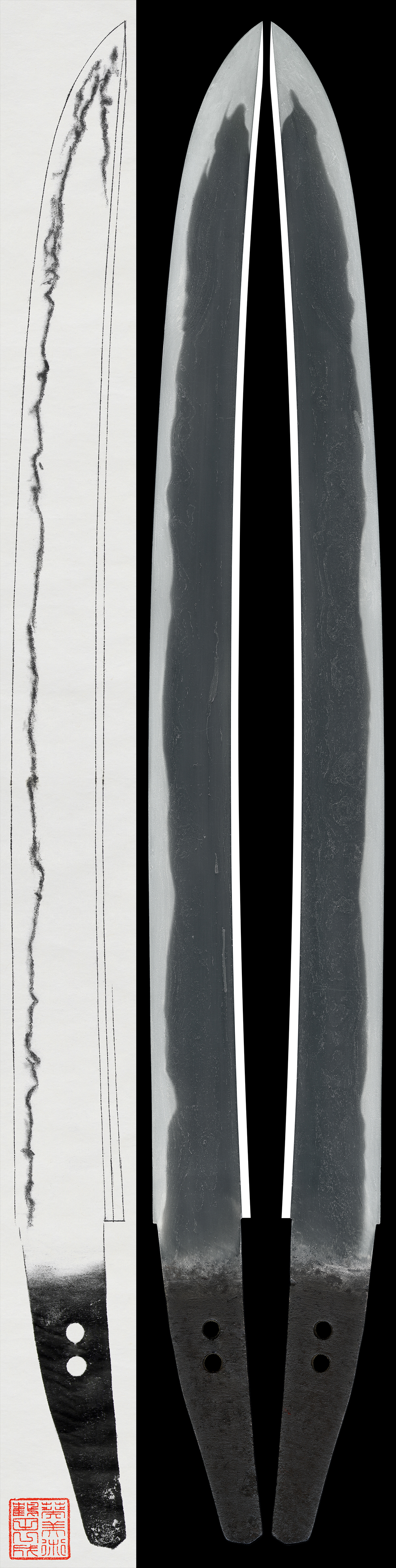 It has a wide blade and thick kasane, with a deep curvature and extended kissaki, exhibiting an excellent overall shape.