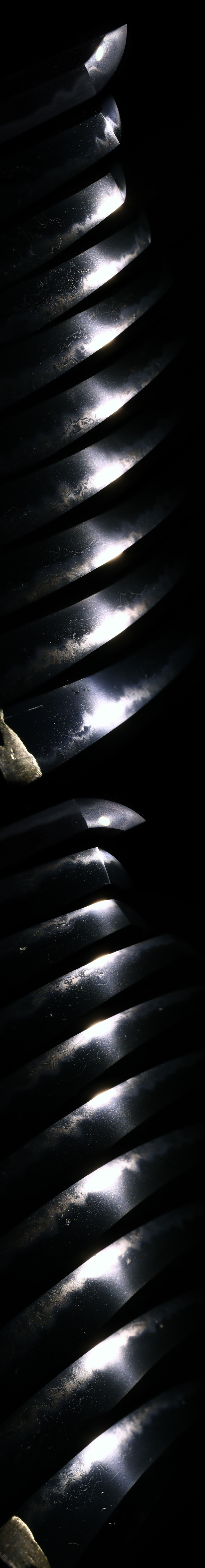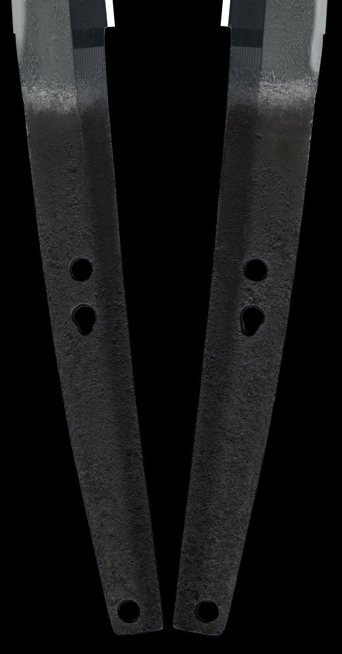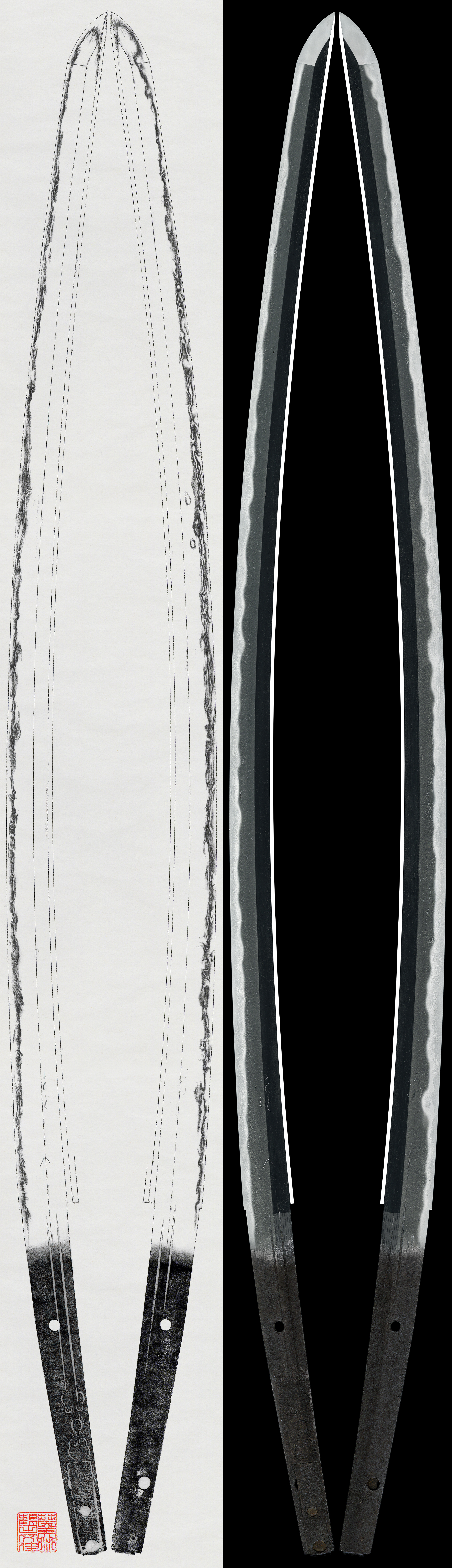 Shape:This is a suriage mumei (unsigned and shortened) blade with standard width and thickness, featuring a deep curvature and an extended kissaki.